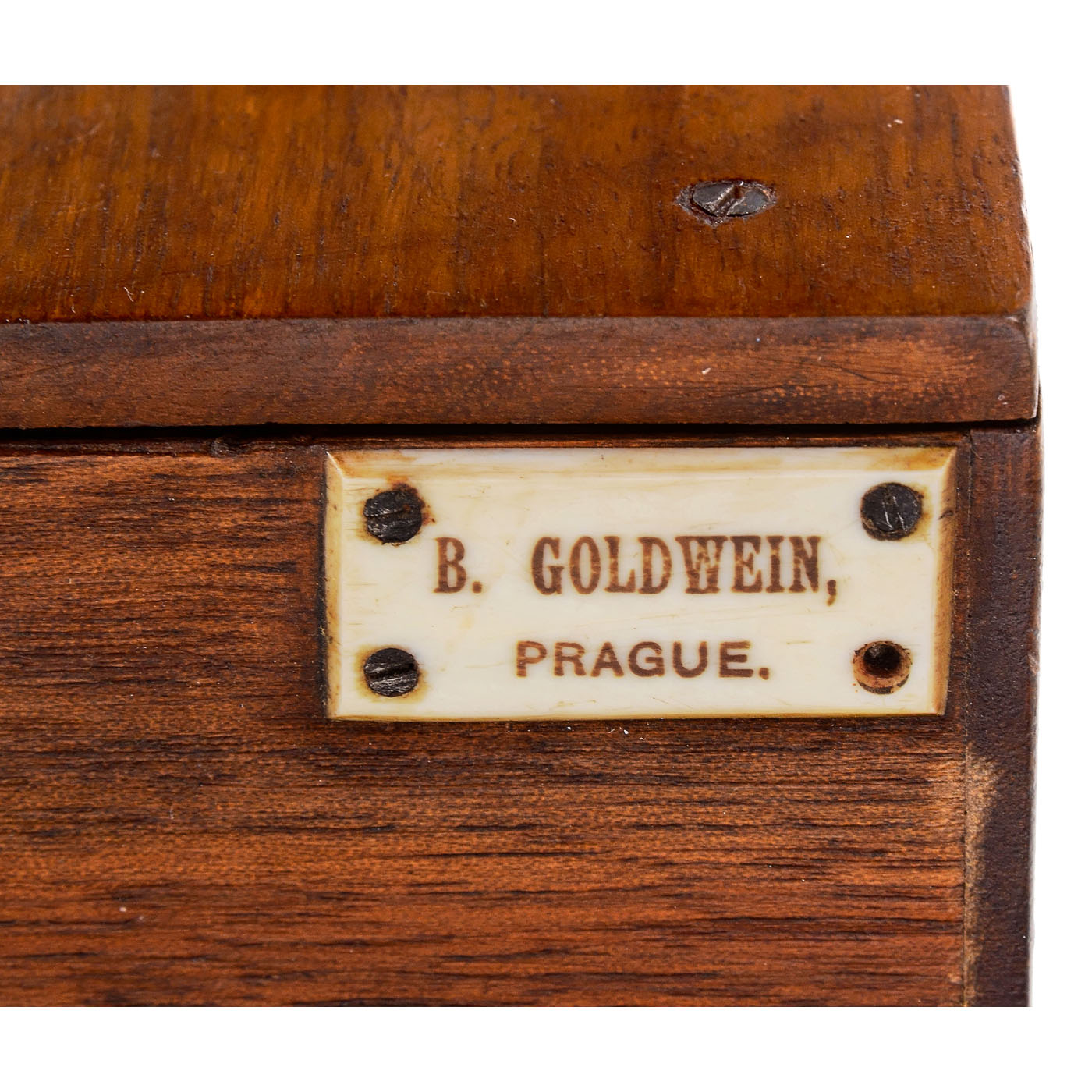 B. Goldwein, Prague. Magazine camera for glass plates in 9 x 12 cm format, fine wood casing (presumably mahogany), leather interchangeable case, Anastigmat lens, guillotine shutter (releases), 2 viewfinders, inserted cassettes. Version with manufacturer's plate. Very rare detective camera, which has increased significantly in value over the last 10 years.