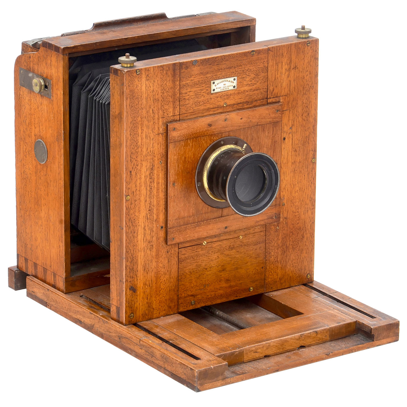 G. Houghton & Son, 89 High Holborn, London. Dark mahogany, for 21 x 21 cm format. The front standard slides laterally and can be locked in position using continuous rods, extension up to approx. 60 cm. The wide rear panel is hinged and designed for safe transport of the focusing screen and film holder which can be slid into place one after the other. With unmarked brass lens, probably a Petzval type 4/24 cm with iris diaphragm; the studio film holder for 16.5 x 21.4 cm plates contains a glass negative showing the bust-length portrait of a gentleman from c. 1910.