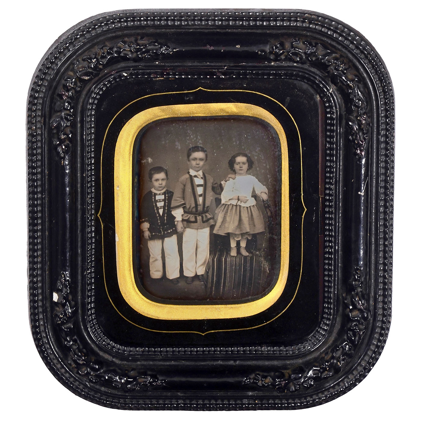 Photograph and painter Gustave, 35 Boulevard de la Bonne Nouvelle, probably Paris. In a plaster frame, 25 x 22 cm. The daguerreotype depicts a group of children, image size 9 x 11.5 cm (not a standard size), a beautiful, warm-toned image due to gold toning. The protective glass has some minor age-related staining (should be replaced). A charming image of children who remain remarkably still ÿ presumably because, as stated on the back, pictures could be taken "in just a few seconds and in any weather. In a large, well-heated room with windows ÿ in winter." So, there was a well-heated room available even in winter!