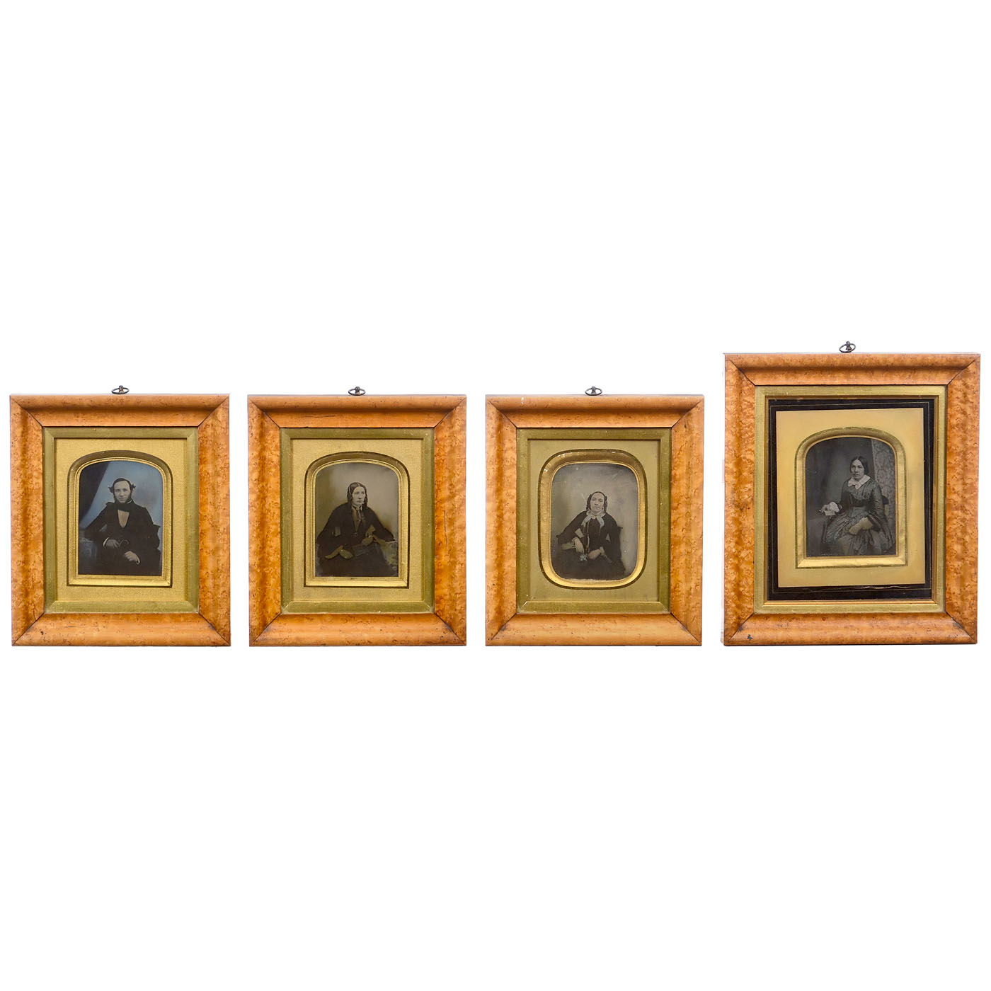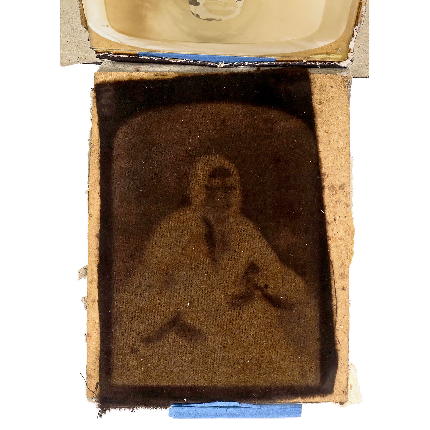 Burlwood frames measuring 25 x 29 to 21 x 25 cm. Two of the portraits depict the same lady a few years apart. The pictures are from England c. 1850ÿ60; they were framed with their protective glass under an additional glass about 20ÿ30 years later. What's special about three of the ambrotypes is that at first glance they look like pannotypes. Because one of the glasses was fogged up too much on the inside and had to be cleaned, it's only upon opening that one sees that underneath the ambrotype is a black corduroy-like velvet, which creates this impression. The velvet has been bleached in the transparent areas over decades of hanging, thus creating a negative that brightens the shadows, similar to a contrast mask. In other words, an autocatalytically developed photograph on fabric in addition to the ambrotype. A very special piece for a sophisticated exhibition, especially for collections focusing on the aspect of illusion in photography.