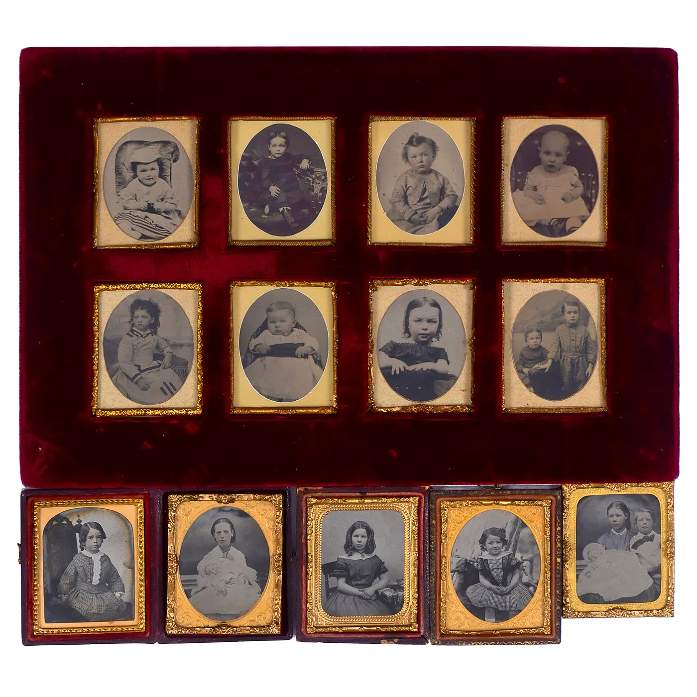 All ambrotypes are approx. 4.5 x 5.5 cm in size, each with a different frame. 1ÿ8) Velvet hanging frame 30 x 21 cm with eight framed portraits of children belonging to a family or relatives. The cover reveals only two different photographers. ÿ And: 9ÿ13) Five more portraits of children, some with siblings, are presented in cases, hanging cases, or brass frames. ÿ Representative depictions of children from middle-class families in England.
