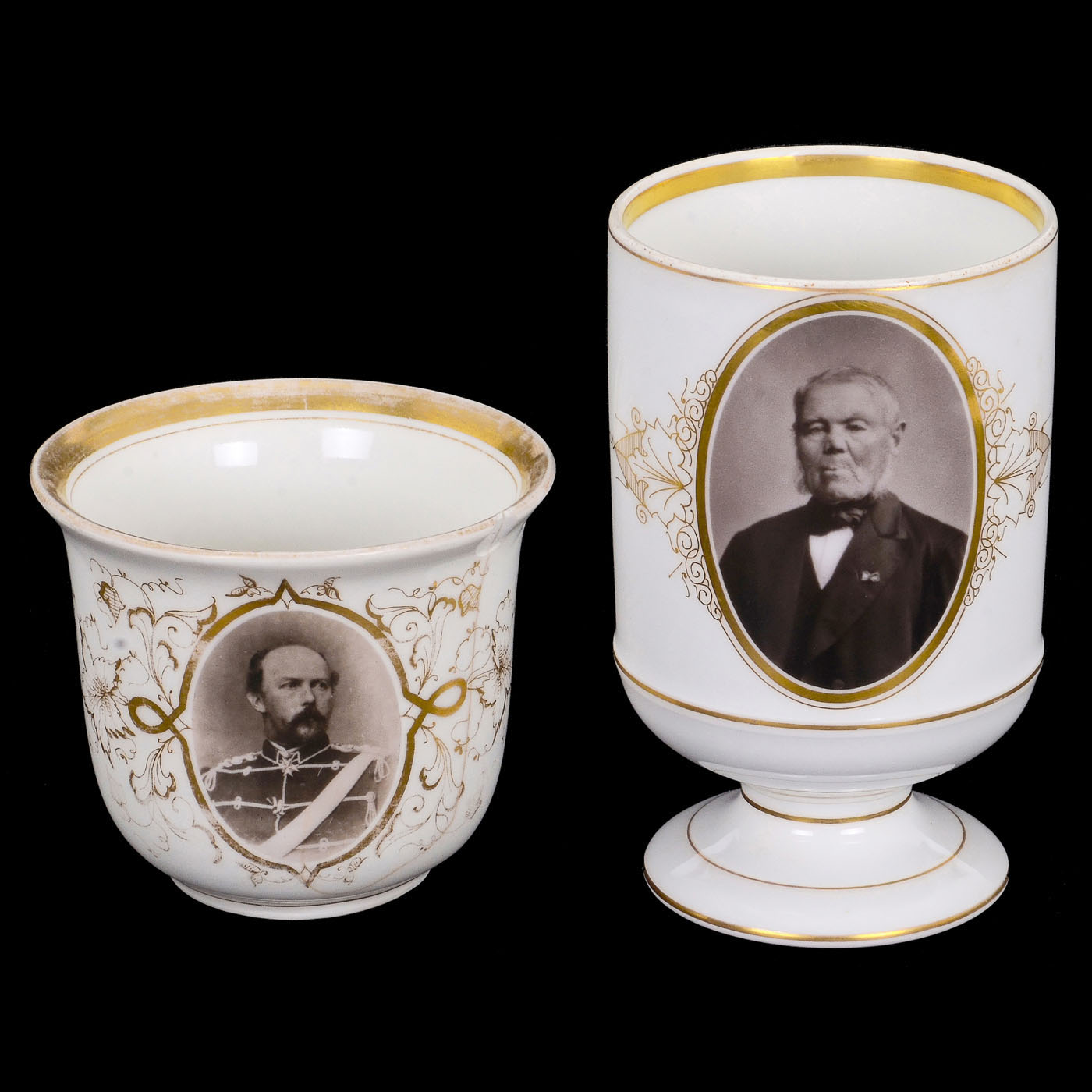 1) Japan, c. 1860. Cigar box with four doors, each adorned with albumen prints of young Japanese women (perhaps geishas) of the period, when gentlemen preferred smoking cigars; with a rotating mechanism and a turned-wood knob; drawer for a lighter. ÿ 2) KPM Berlin. Coffee cup with a photograph of a portrait of Prince Friedrich Karl of Prussia in uniform; damaged. ÿ 3) KPM, Berlin. Large porcelain plate with a family portrait; dimensions marked on the back: 275 x 223 mm; an unusually large size and very rare. ÿ 4) Carl Tielsch Porcelain Factory, Altwasser, Silesia. Chocolate cup with a portrait, inscribed "In memory of Father Kr