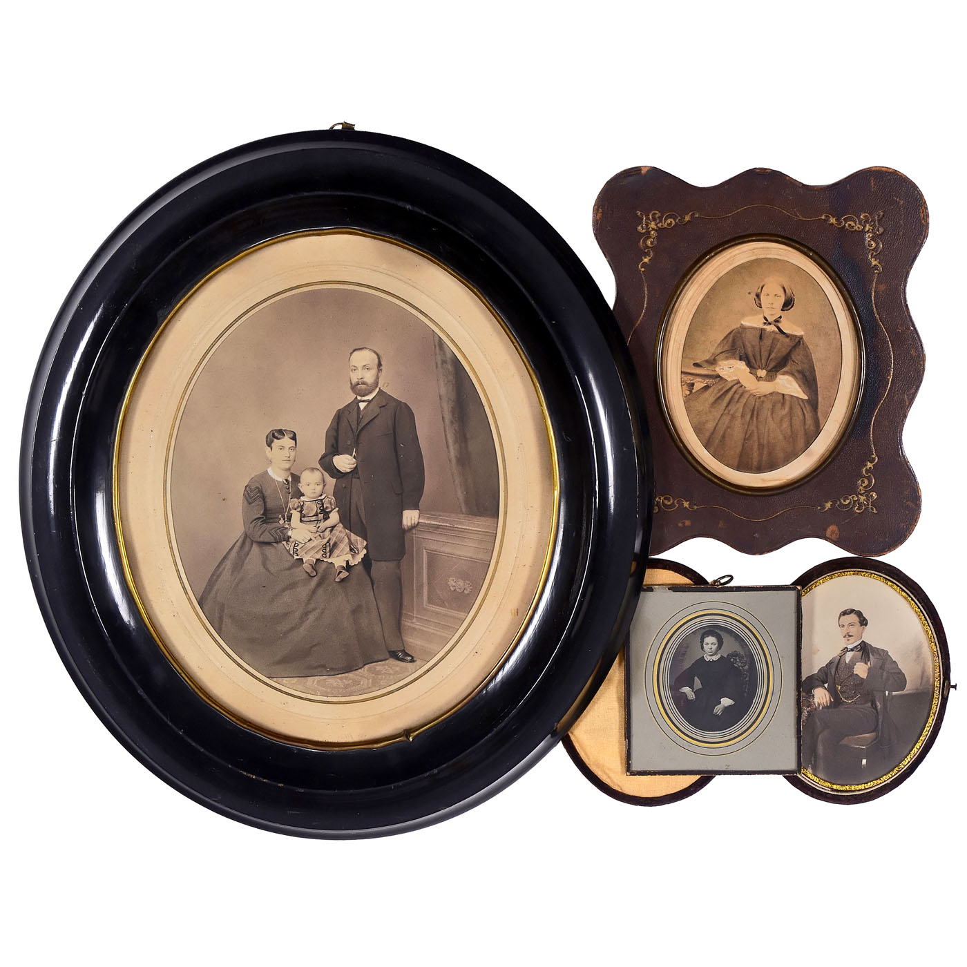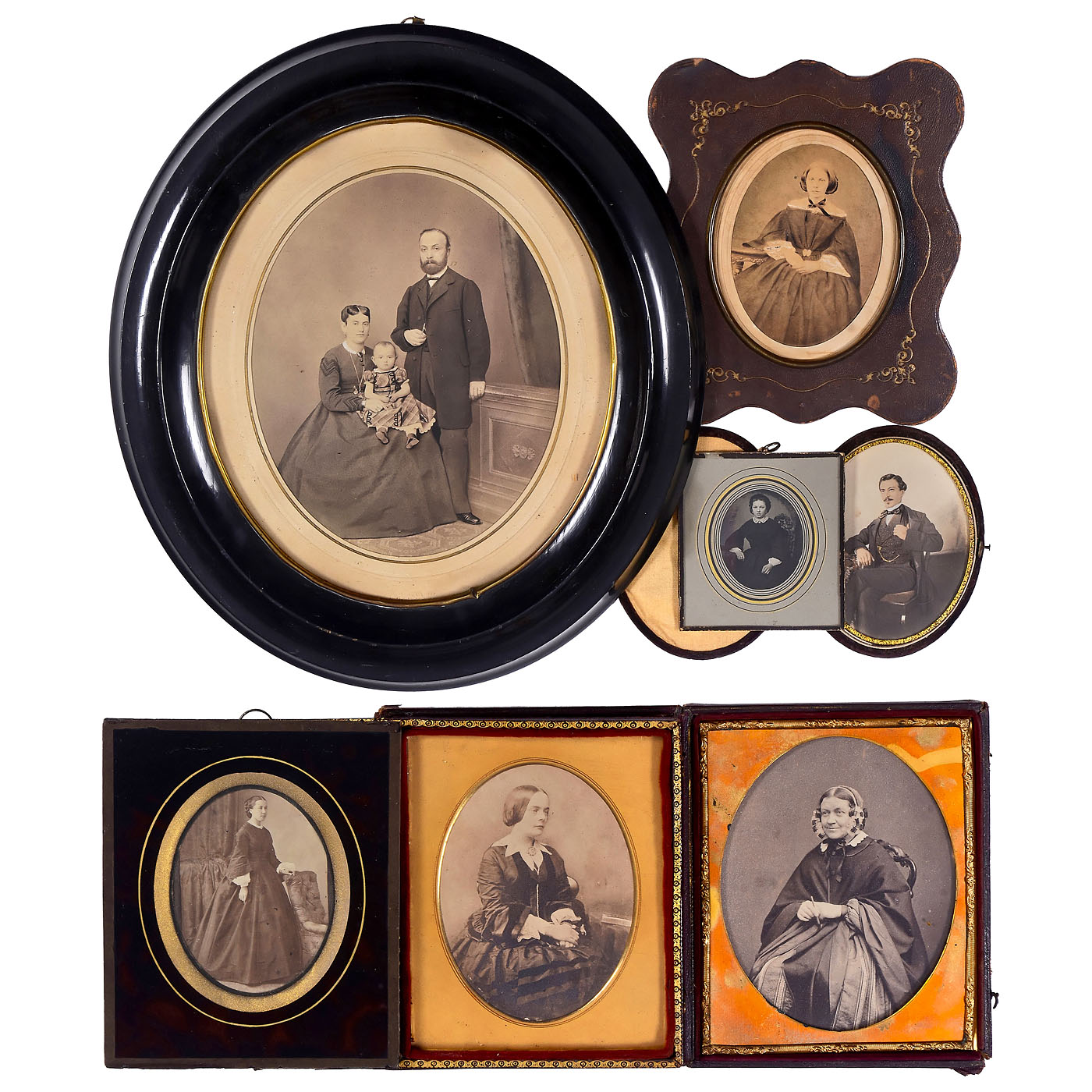 Early salt prints and printing-out papers, mostly in smaller formats, worthy of exhibition. 1) Young woman, salt print in leather frame, 18 x 21 cm. ÿ 2) Excellently colored portrait of a man in an oval, hinged velvet case, 11 x 14 cm, with domed protective glass. ÿ 3ÿ4) Two identical dark-red leather cases, 10.5 x 13 cm, showing a young woman (with personal information enclosed) and an older lady holding a pen. ÿ 5) Hanging glass frame, 11 x 13 cm, full-length portrait of a young woman, printing-out paper. ÿ 6) A prime example of a perfect ambrotype, equivalent to a very good photographic paper, in a 10.5 x 9.5 cm hanging glass frame. A very good exhibition piece! Much chemical experimentation was conducted to create a developer that would develop silver to be as light as possible, rather than black. Here, it worked, especially in the brilliant white of the lace collar! ÿ And: 7) Oval frame 38 x 34 cm with a full-frame family scene, a very good example of a salt paper print.