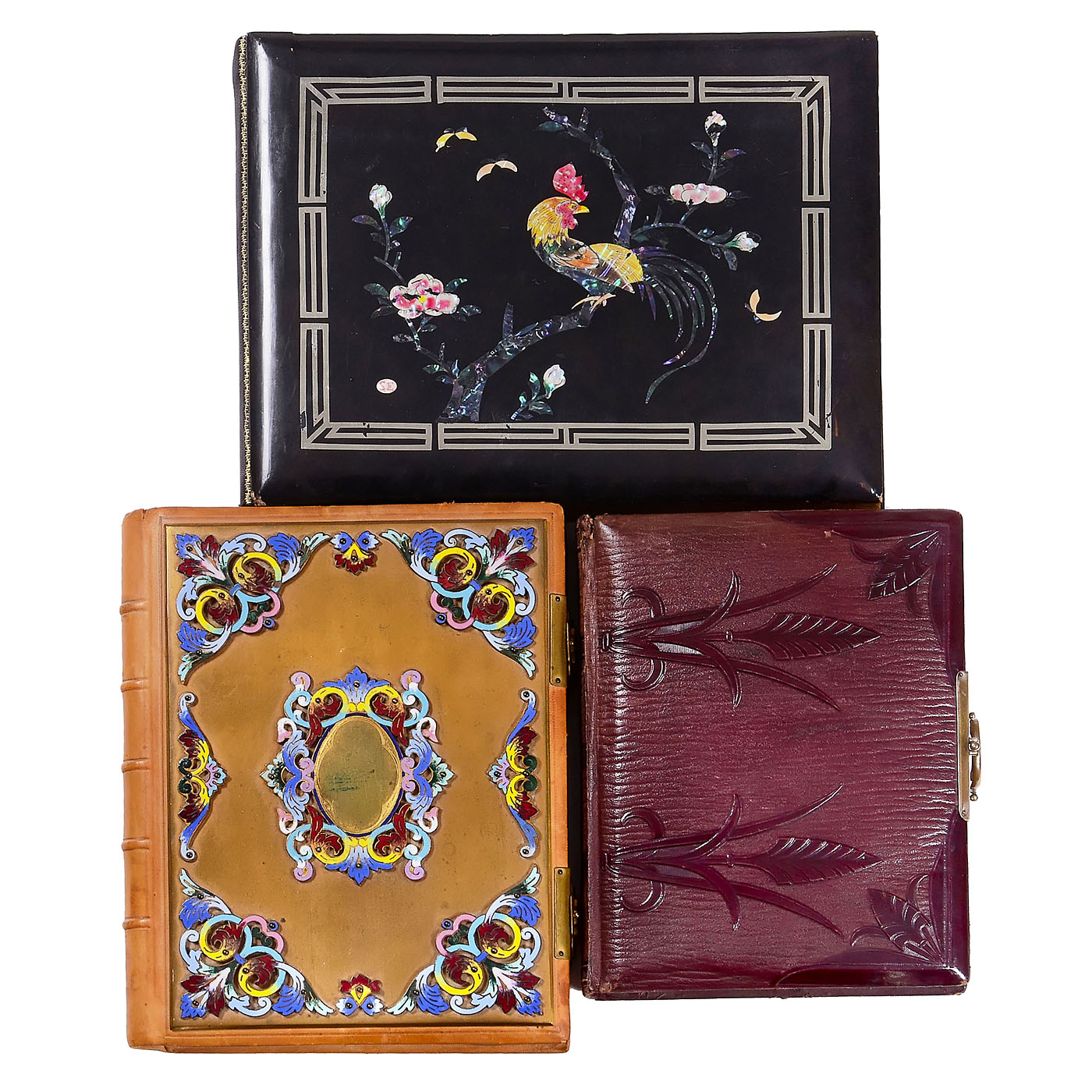 1) Dark-red leather album with music box, 28 x 22 cm, with 8 pages for cabinet cards and carte-de-visite photos, all pages still empty, music mechanism works well and plays loudly, with clasp and built-in key. (3/3) ÿ 2) Metal box in album format, 31 x 25 cm, lined with pink damask fabric, with both clasps. (2-/3) ÿ And: 3) Japanese album with a wooden cover, 36 x 27 cm, featuring elaborate mother-of-pearl inlay, with nine pages for carte-de-visite photos, all pages hand-painted with Japanese motifs. (3/3)