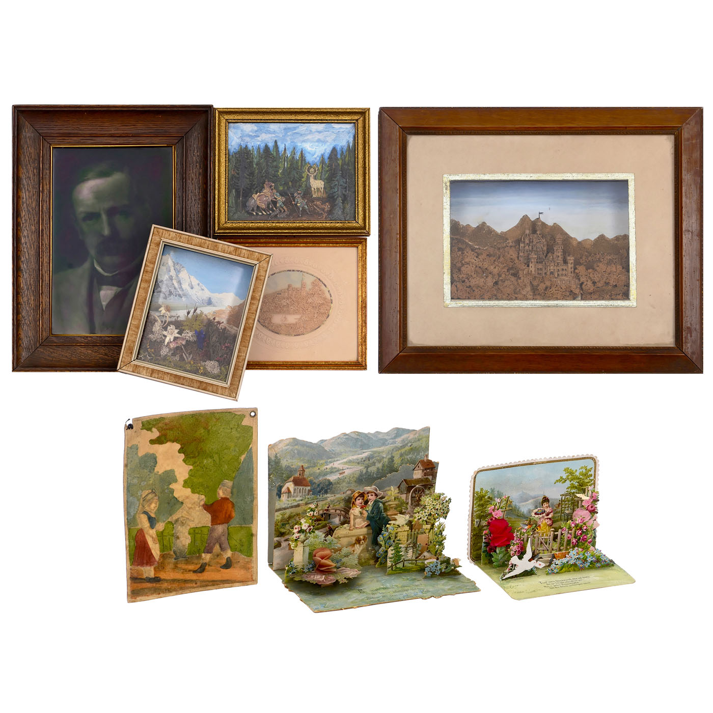 1) George Cartlidge, Staffordshire. "Photo-Ceramic Relief", c. 1910. In a 24 x 32 cm frame, a 16 x 23 cm porcelain picture that looks like glass from the front, but is not flat, with the heights and depths of the portrait. On the back of the porcelain cast, there is a print: "Portrait of the R. Hon. David Lloyd George modeled by Geo. Cartlidge after a photograph by Ernest H. Mills." It has been tested to see if it is translucent like a lithophane, but it is not. There are some cracks in the "surface glaze". A very rare subject.