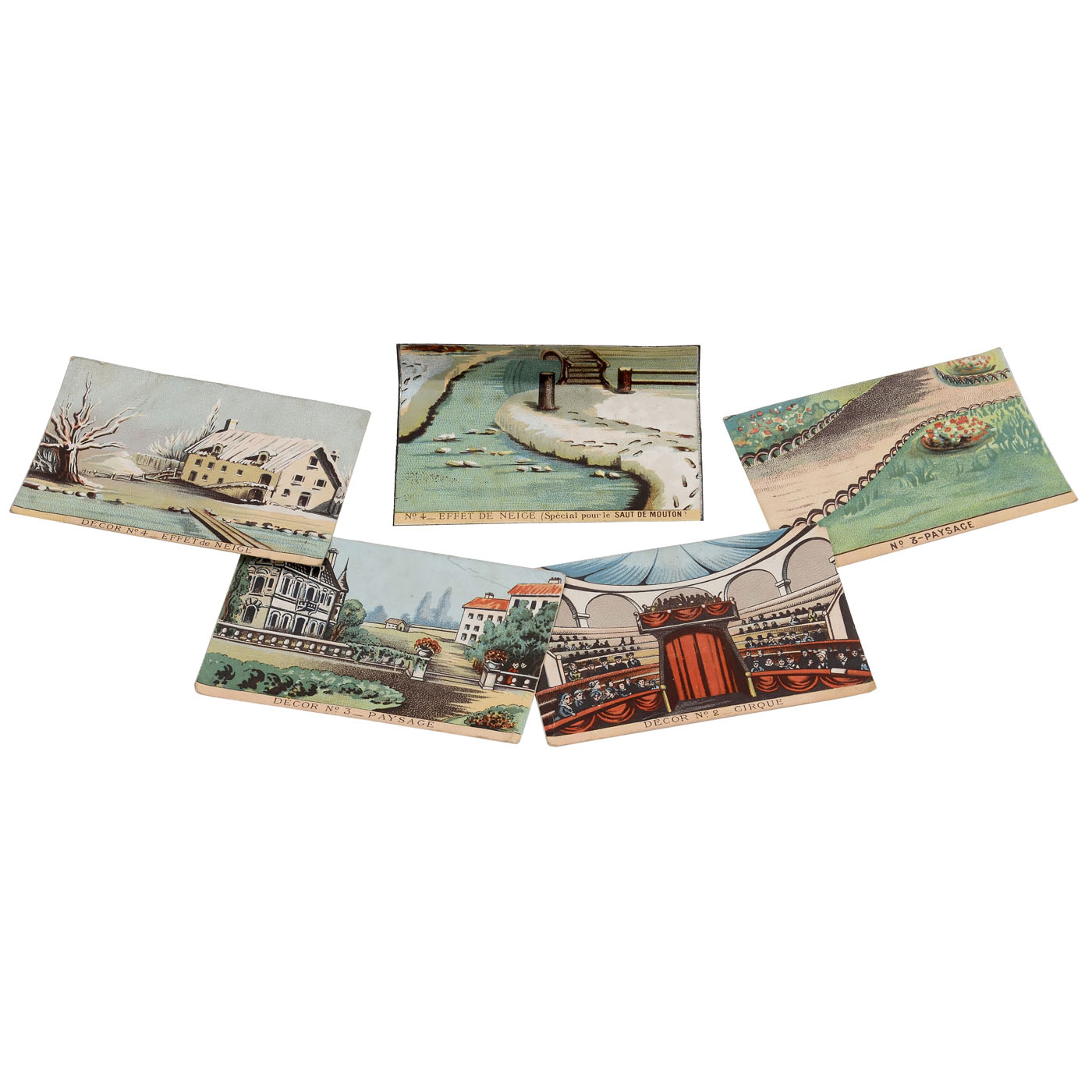 Reynaud, Paris. With 8 ? in. (22 cm) diameter lacquered metal drum, with all mirrors (one fogged), candle holder, shade (replaced), in mahogany case with viewing window and card proscenium, wd. 9 ? in. (25 cm). With all 10 strips (with cracks) and with stage sets, No. 1: Interieur and No. 1 Decor originally firmly mounted), No. 2: Cirque, No. 3: Paysage and No. 3 Decor, No. 4: Neige and on bent sheet metal No. 4 Decor, as well as No. 5 the rare mirror for Decor No. 3 (with crack). Furthermore there is a pull-out mica disc in the opening of the "theater view". Good original condition.