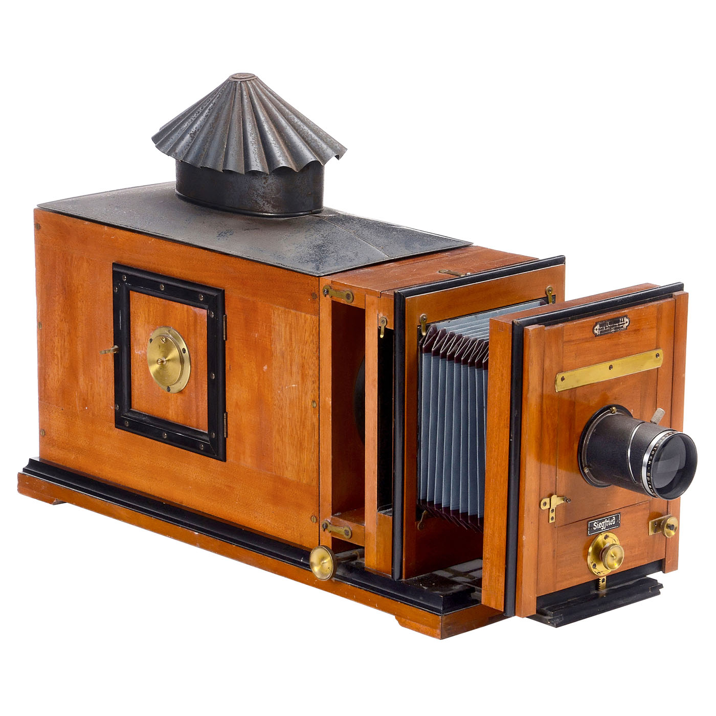 Both devices could be used as they are today. 1) Unger & Hoffmann AG, Factory for Projection Apparatus, Dresden-Berlin. Model "Siegfried", c. 1900, beautiful wood, probably reddish-stained and polished beech, L/W/H 66 x 25 x 47 cm, more recently converted for 220V/150W projection bulbs, including a modern double condenser, working, with a hidden switch inside. The 15 cm ? condenser at the front of the device is cleverly designed to be lifted for cleaning. Green interchangeable bellows, extension to approximately 35 cm, with a Rodenstock Splendon 250 mm interchangeable lens in a focusing mount.