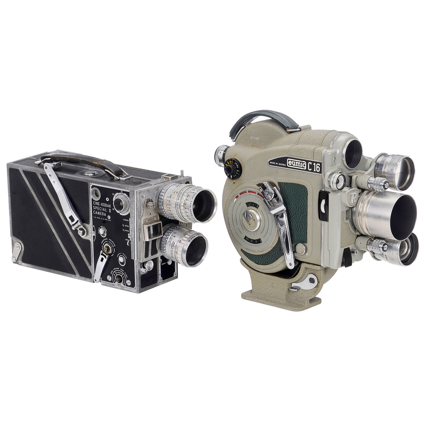 All spring mechanisms are functional! 1) Eastman, Rochester. Cine Kodak Special II, c. 1960. 16mm film camera for 30m daylight spools. Two interchangeable lenses: Ektar 1.4/25 mm and 1.6/40 mm. Optical viewfinder. Spring-driven, 8