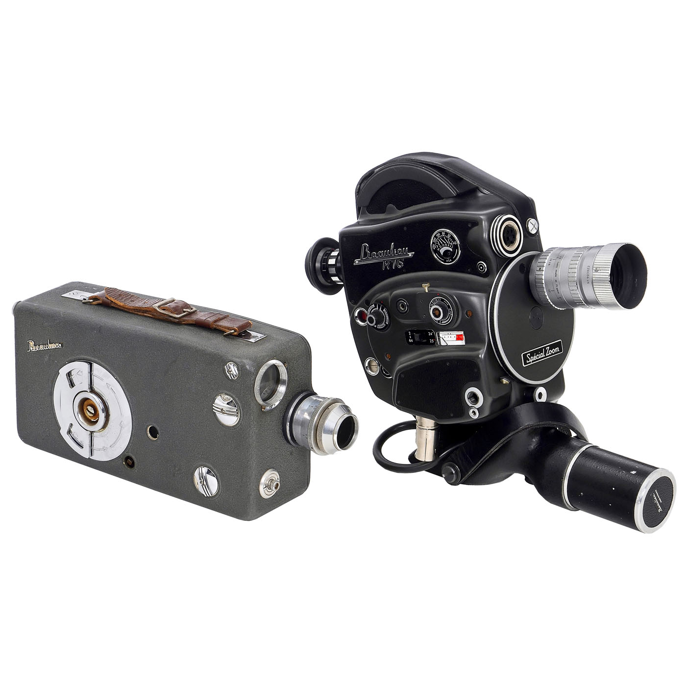Beaulieu, Paris. 1) R16 film camera for 30m daylight reels with 16mm film. Lens: Bell & Howell Angenieux 1.3/15 mm, SLR camera. Drive: electric motor, 2