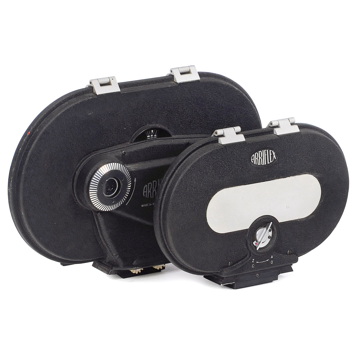 Arnold & Richter, Munich. Arriflex 16 M reflex camera for 16mm film. Three interchangeable lenses on a turret mount: Schneider-Kreuznach 1.4/16mm, 1.4/25mm, and 2/35mm. Angled viewfinder, instruction manual, and handcrank motor. Special feature: The camera comes with three different film magazines: One for 60m, one for 120m film rolls, and the rare 300m magazine for 16mm film (coaxial design). The camera is in near-mint condition. Electrical functions have not been tested.