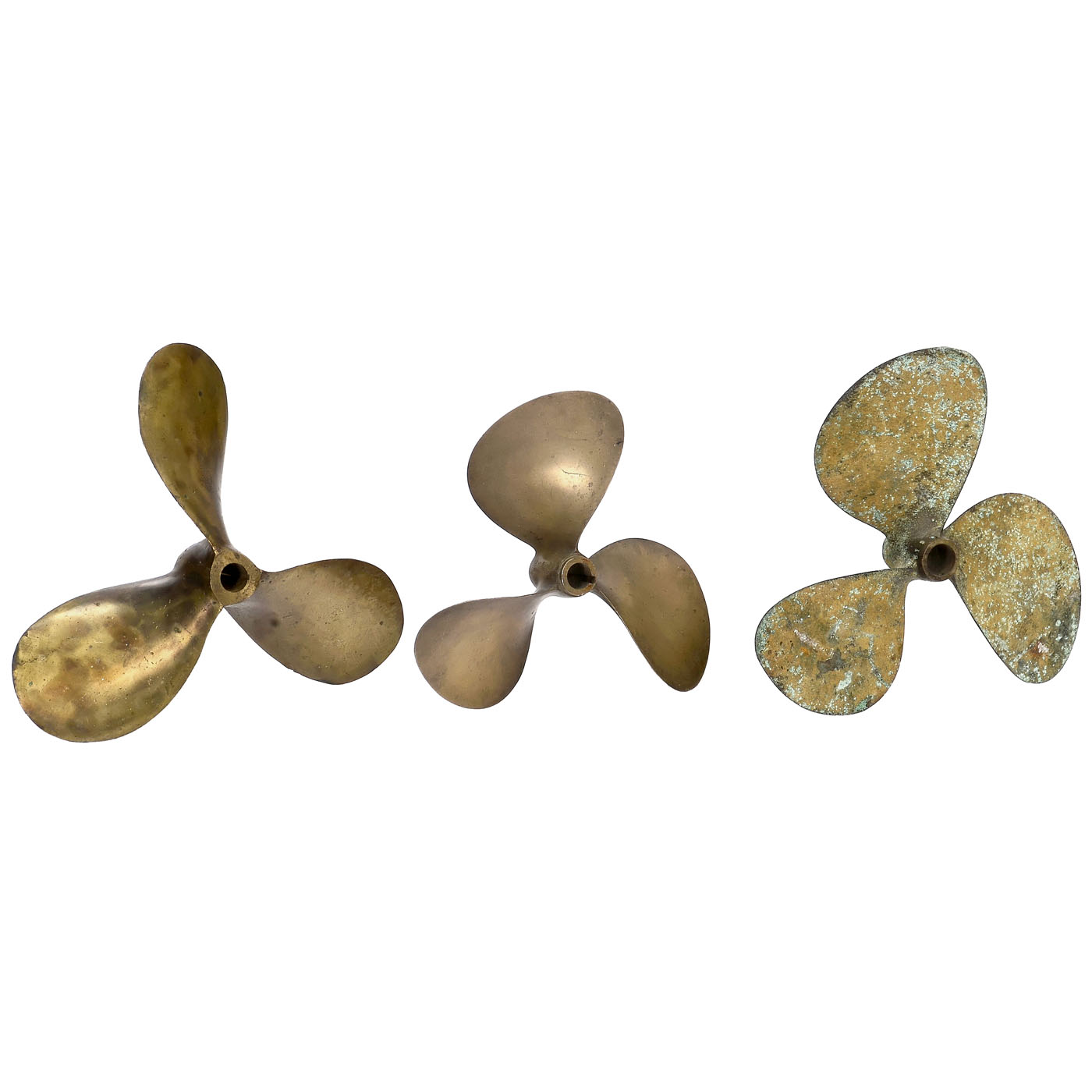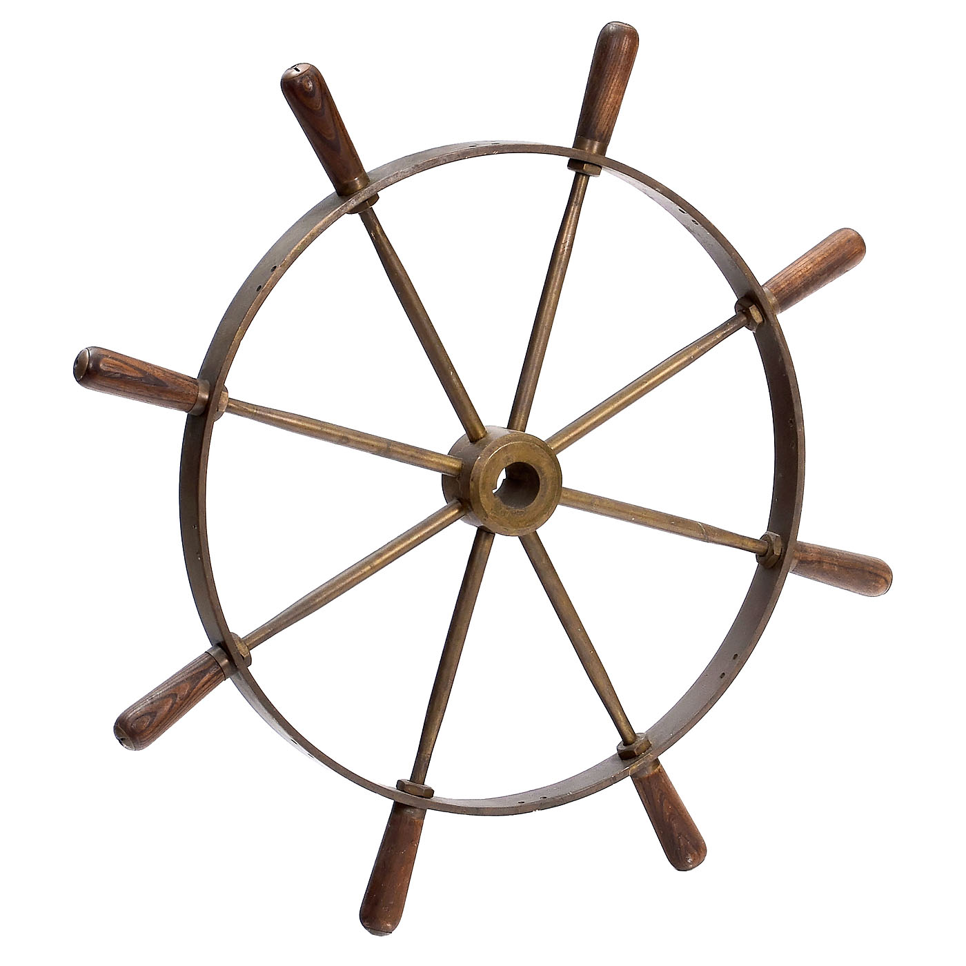 Bronze. Steering wheel with 8 spokes, wooden handles, ? 30 ? in.; 3 heavy propellers, ? 15 3/5, 16 ? and 18 ? in., one of them with traces of seawater.