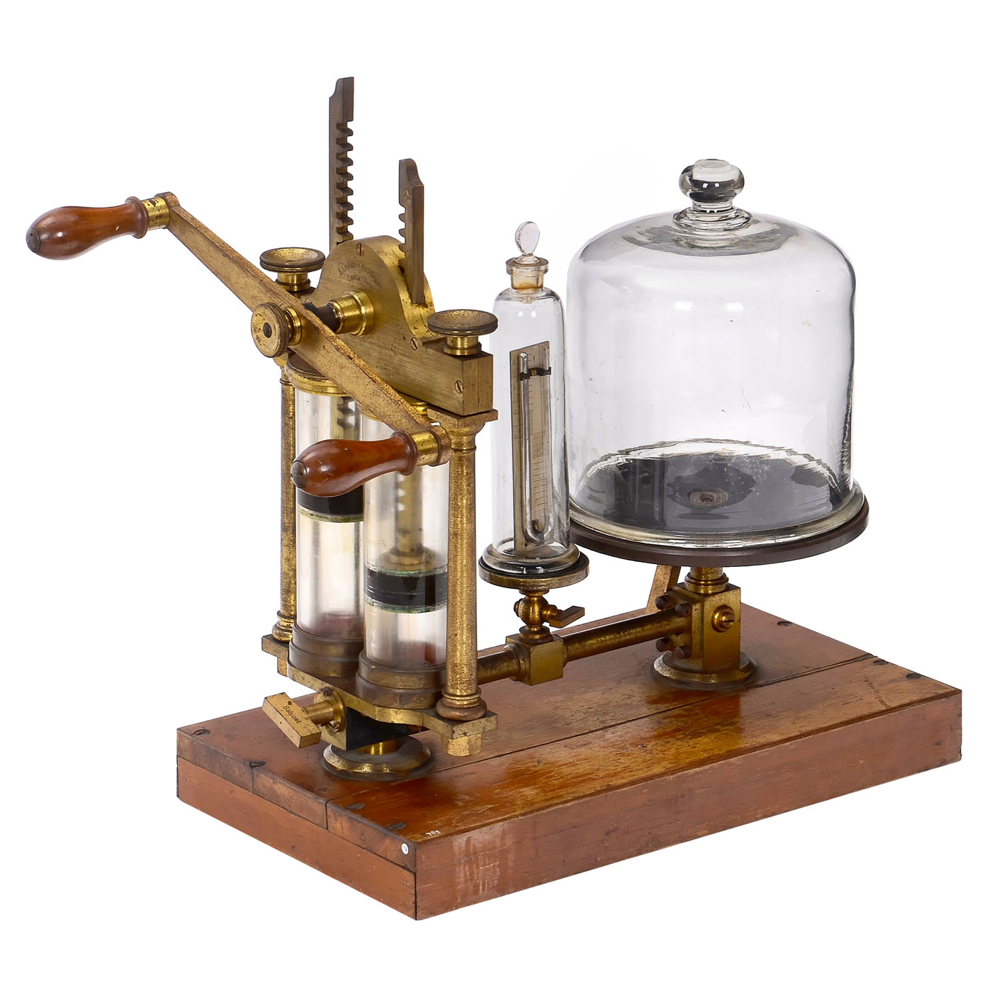 Signed "E. Leybold's Nachfolger, Coeln, Rhein" (Cologne), lacquered brass, with 2 pumps, manometer (damaged) and a sturdy glass receiver, mounted on walnut base, overall size 22 x 12 ? x 23 3/5 in.