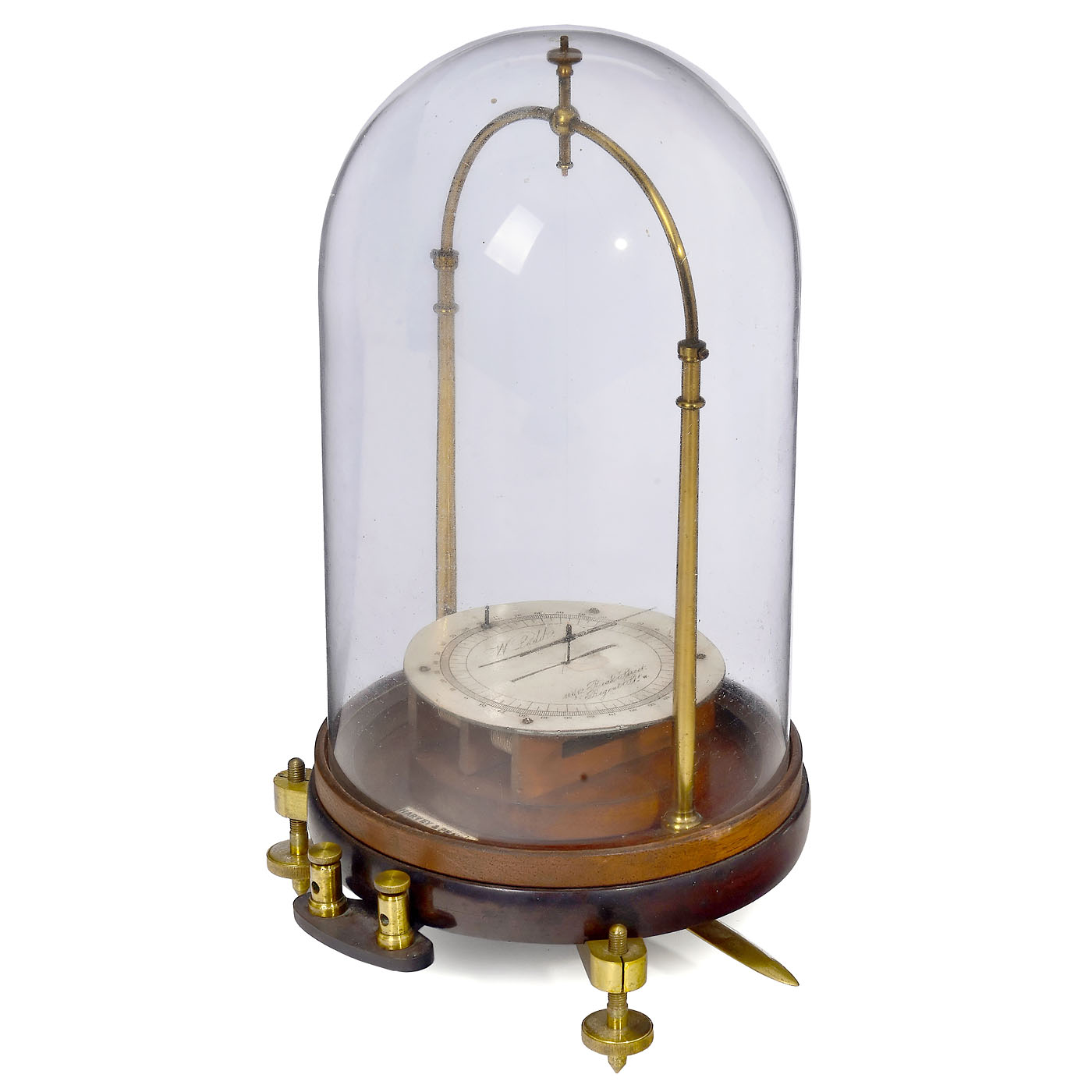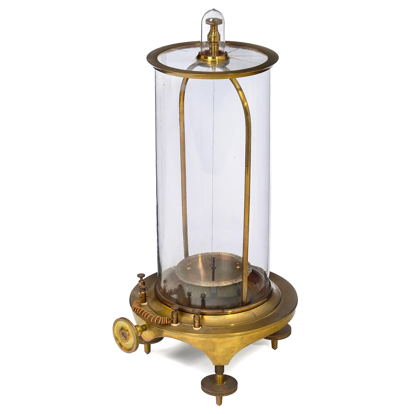 1) Needle galvanometer, J. Eiss, Vienna, c. 1880, with astatine needle according to Nobili, brass, glass cylinder, upper glass plate with cracks, total height 14 ? in. ÿ 2) Electro dynamometer, Siemens & Halske, c. 1890, torsion galvanometer with one fixed and one movable coil, for high-current measurements, height 12 ? in. ÿ And: 3) Needle galvanometer, c. 1870, W. Ladd, London, with glass dome, height 14 ? in.