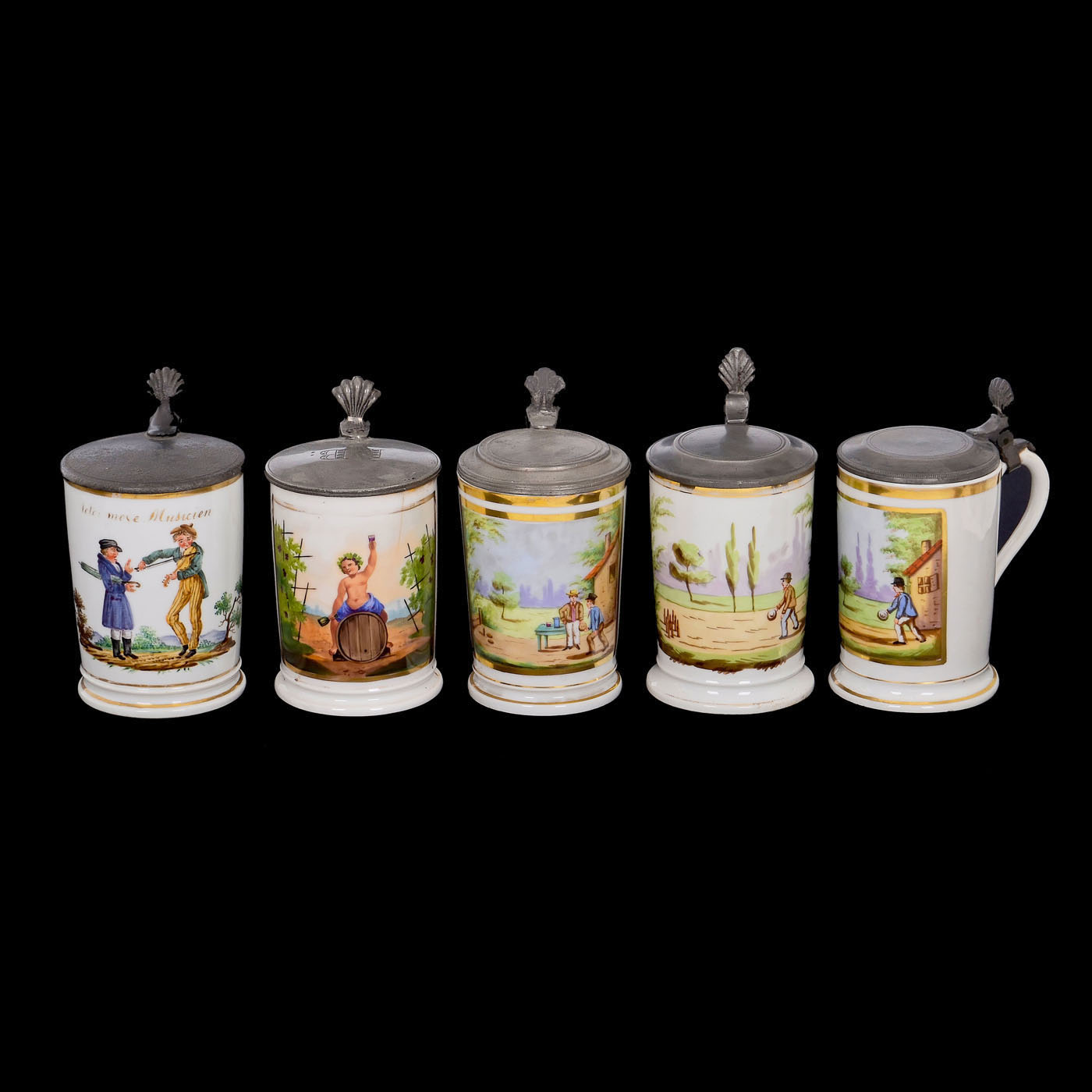 Presumably Belgium, hand-painted, mostly with game or sports motifs (e.g. archery or bowling), but also a love scene, pewter lids, some marked "Mertens Anvers", height approx. 13 cm each, one jug with a hairline crack, otherwise used condition.