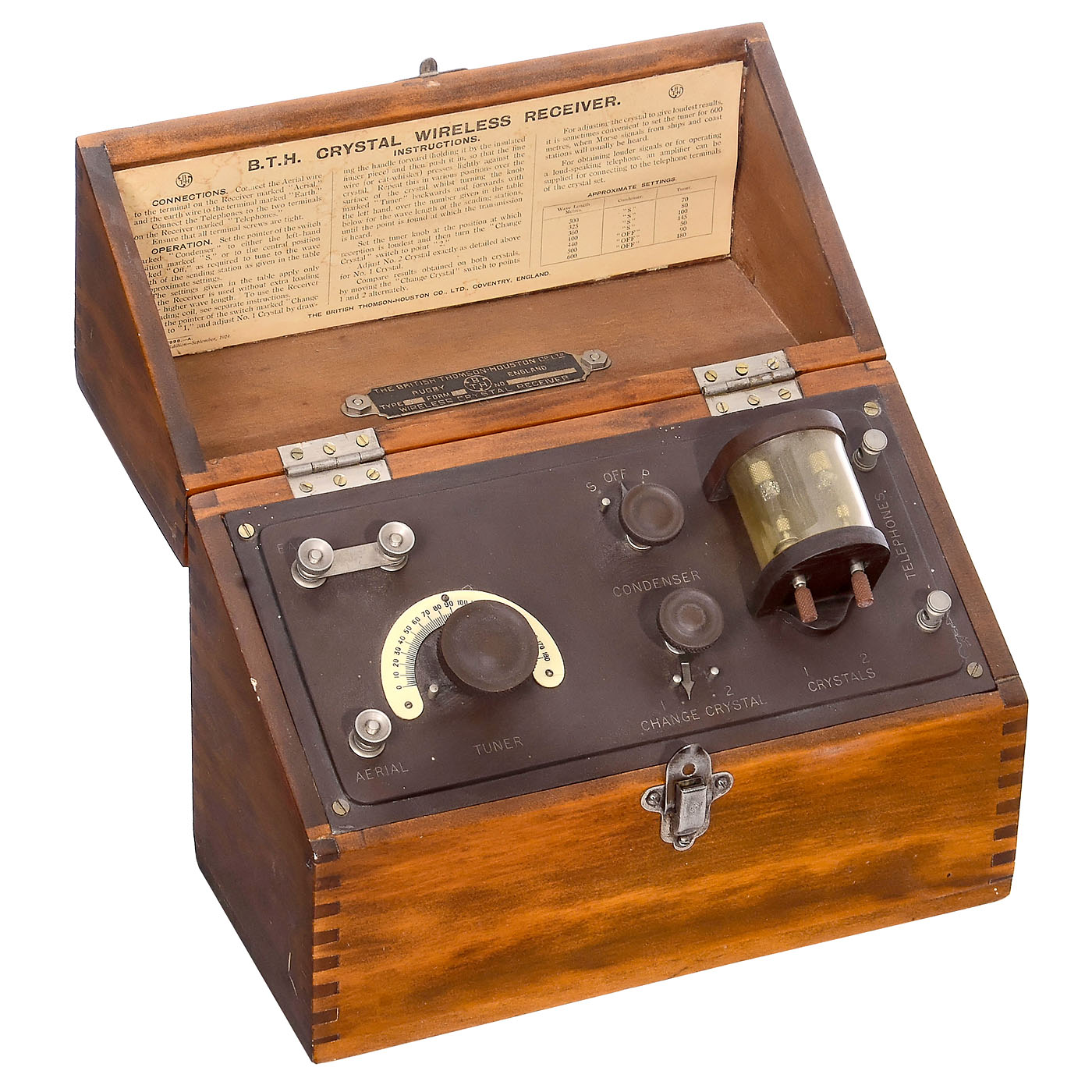 1) "Gecophone" Crystal Set No. 1, 1922, Type B.C. 1002, with BBC decal, instructions under the lid, good condition, with Sterling earphones. ÿ 2) Double crystal receiver, The British Thomson-Houston Company, crystal selectable with switch, slanted console device. ÿ And: 3) Vitus, France, presumably a replica, oak cabinet.