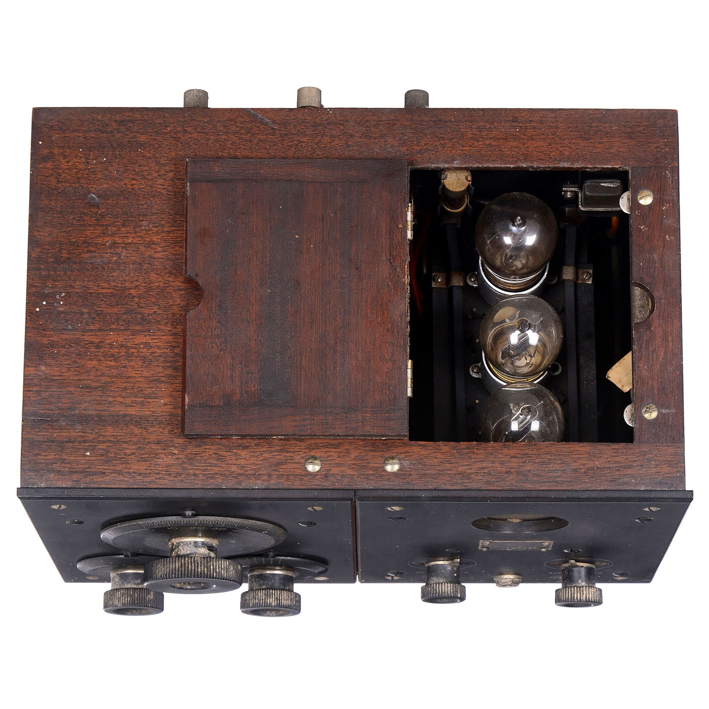 Westinghouse El. & Mfg. Co. Short Wave Regenerative Receiver, 3 tubes, medium wave only, battery operated, for headphones, with additional loading coil for long wave reception and matching headphones from Western Electric. ÿ This device was manufactured in Germany as Telefunkon D E304 by Telefunken. ÿ Complete with tubes and all components.