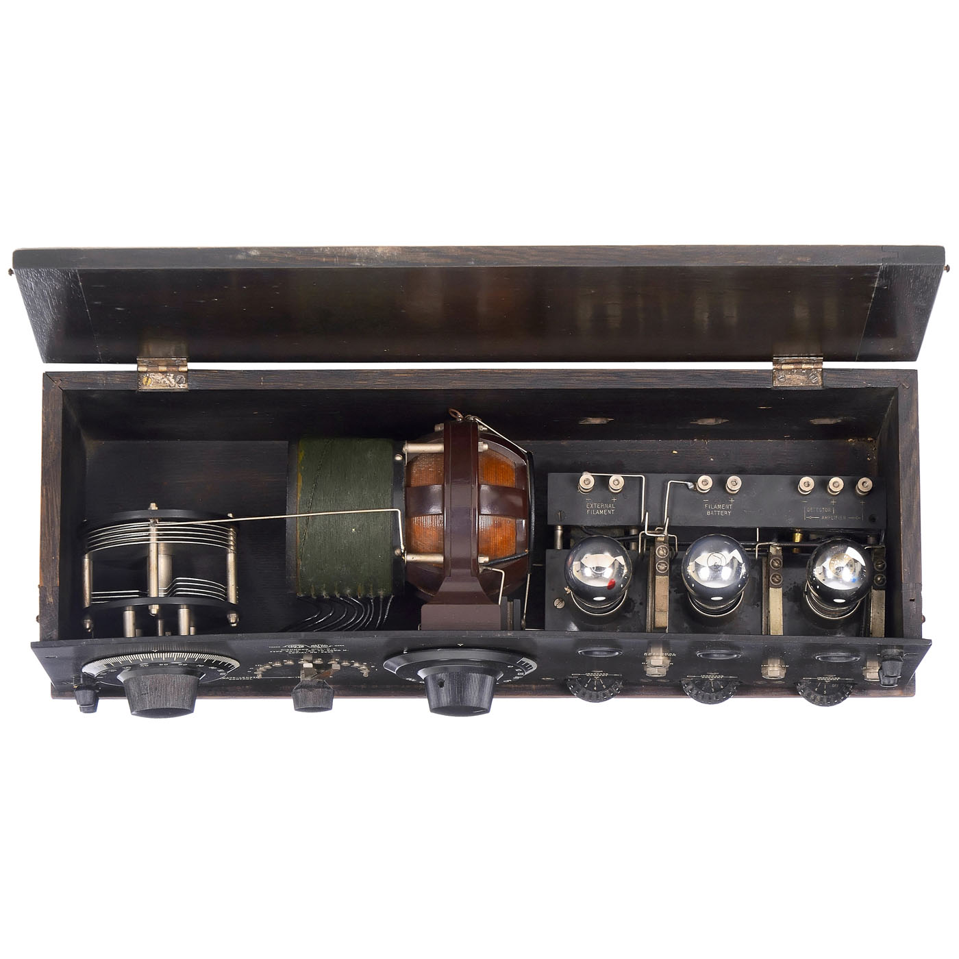 Grebe, A.H. & Co., Richmond Hill, New York. 3 tubes, longwave and medium wave, battery-operated, wooden chest-shaped case, width 22 ? in., complete with tubes and all components.