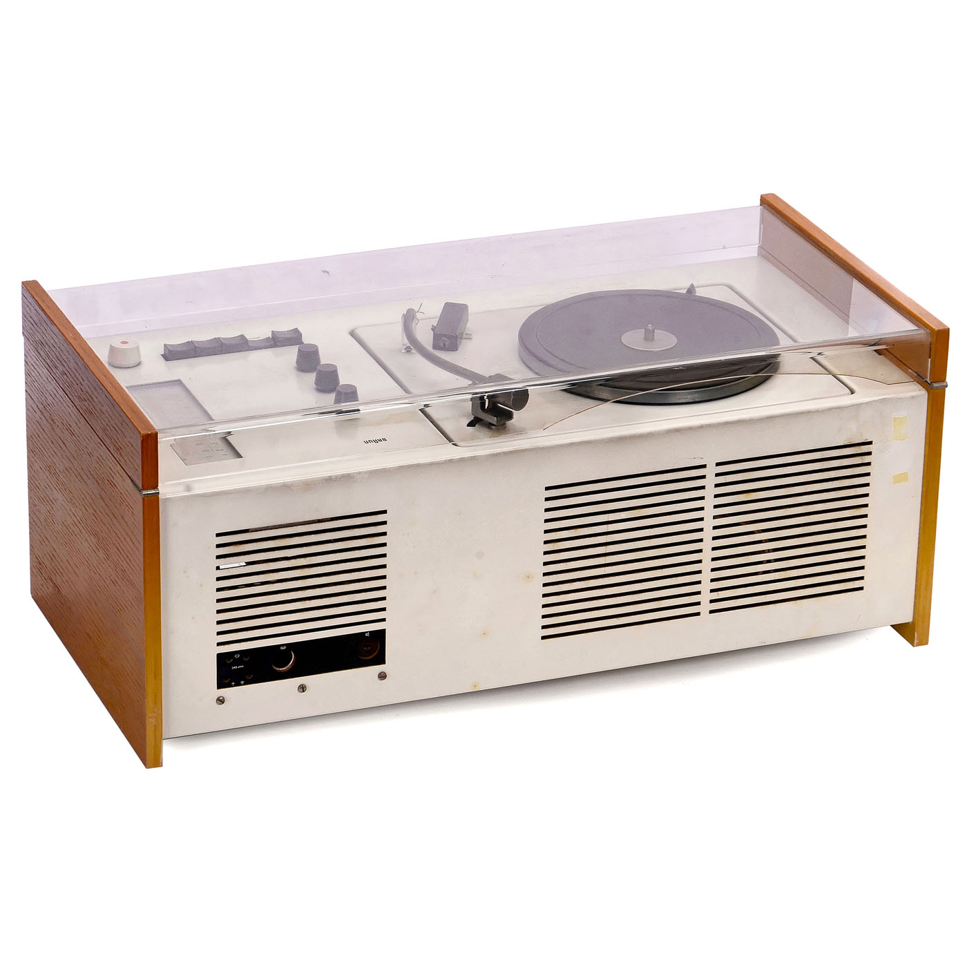 Braun, Frankfurt. Radio receiver and record player, 110/220 volts AC, long wave, medium wave and FM, built-in dynamic speaker, record player with three speeds, white-lacquered metal case with ash-veneered wood sides and acrylic cover, good optical condition, record player defective, pickup loose enclosed, radio and amplifier working. With quick start guide and circuit diagram.