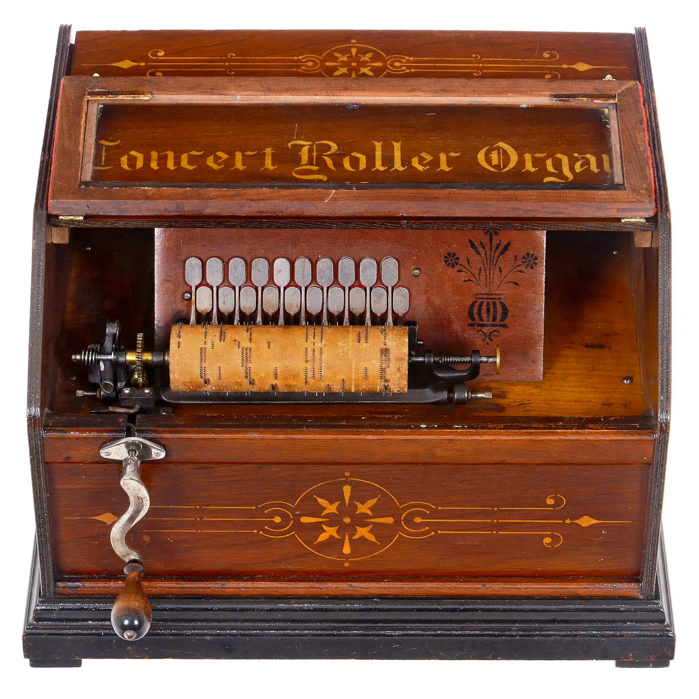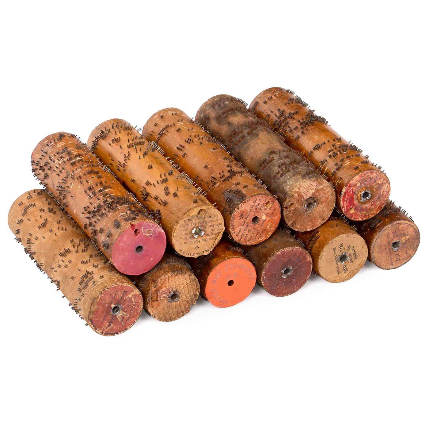 The Autophone Company, New York. Organette with 20 notes, for spirally-pinned wood cobs playing one air on three revolutions, gilt-stenciled wood case, size 18 x 15 x 12 ? in., excellent playing condition, with 12 cobs.