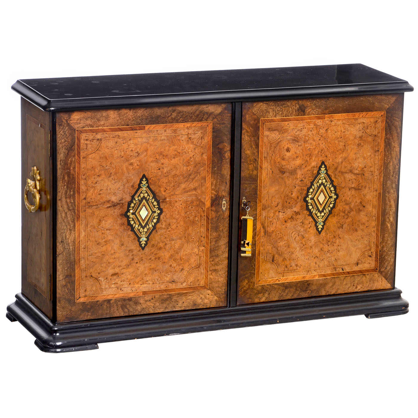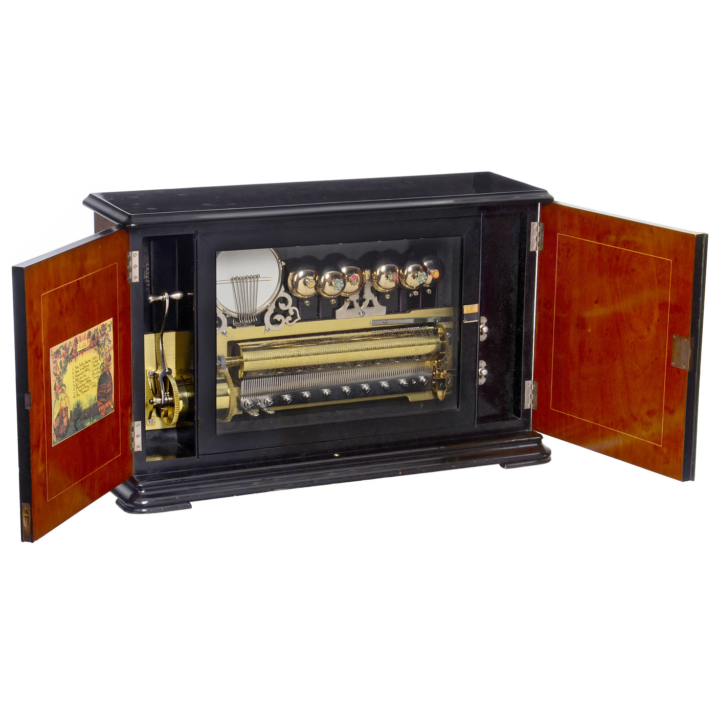 Switzerland, playing eight airs accompanied by six optional saucer bells with polychrome flower finials and skin-drum with ten beaters, 93 teeth in comb (complete), lever-wound double-spring motor, brass movement, copy tune-sheet, upright wood case, ebonized top and plinth, double-doors with root wood veneer and brass and mother-of-pearl inlays, small crack on the left door, brass carrying handles, case: wd. 27 1/4 x ht. 9 x dp. 17?? in. (70 x 23 x 45 cm), cylinder 15 in. (38 cm), with cabinet key.