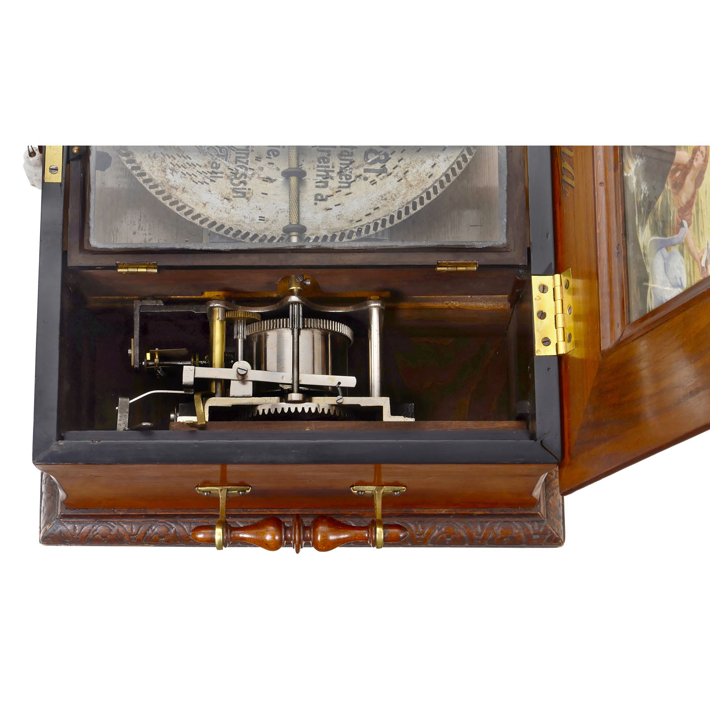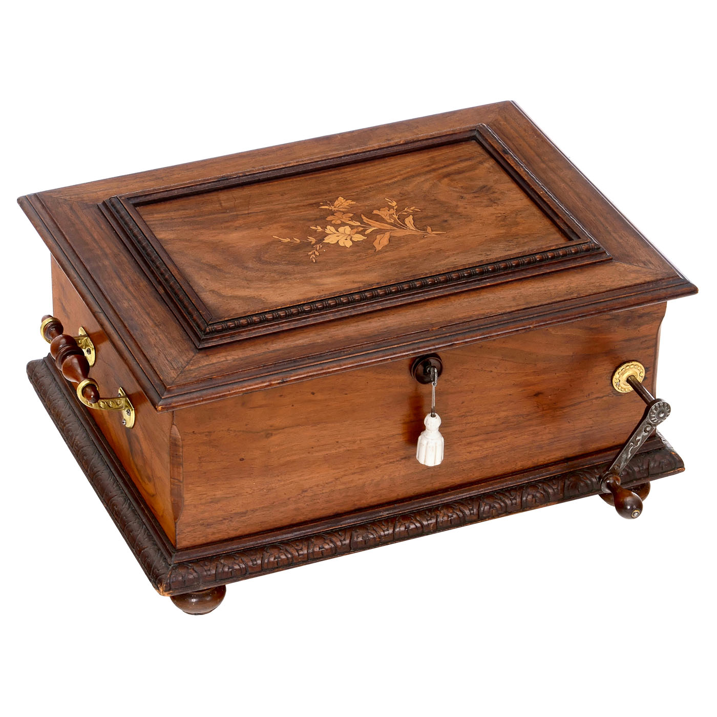 Heinrich Zimmermann, Leipzig. For 11-inch discs, 62 teeth in two steel combs (complete), lid with original lithograph, visible motor under glass, marquetry-inlaid lid, in wood case 19 1/3 x 14 x 9 in., very good playing condition, with 21 discs.