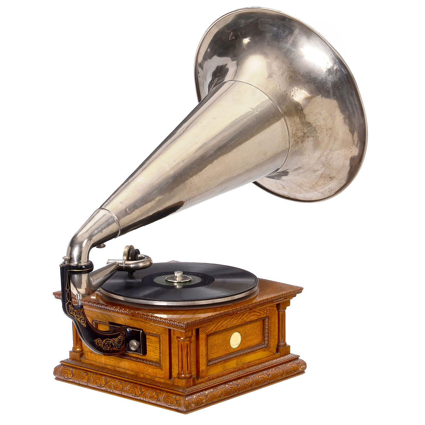 The Gramophone & Typewriter Ltd., London, manufactured for the French market, no. 12153. Carved oak case, four columns, with maker's decal and "Writing Angel" plaque, Exhibition reproducer, triple-spring motor, ? 12-inch turntable, original lacquered arm, nickel-plated brass horn, ? 16 ? in., length 27 in., very good working original condition.