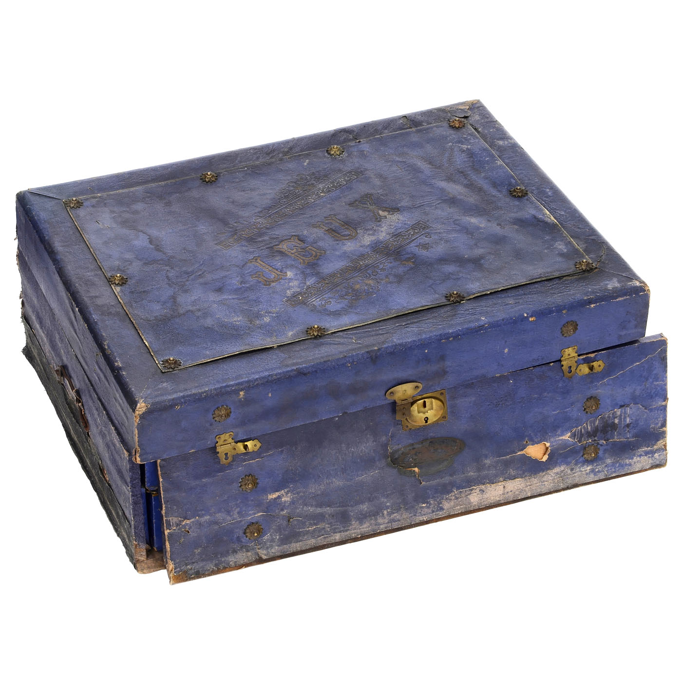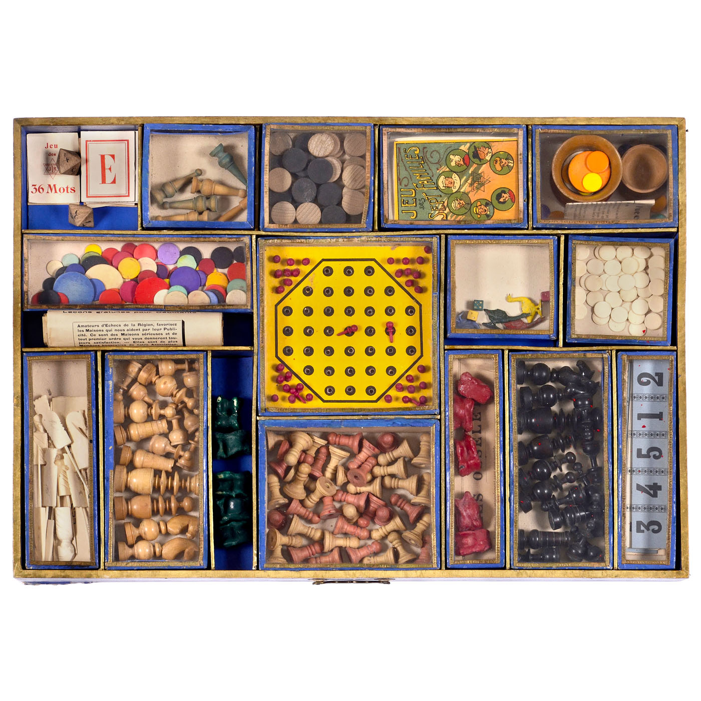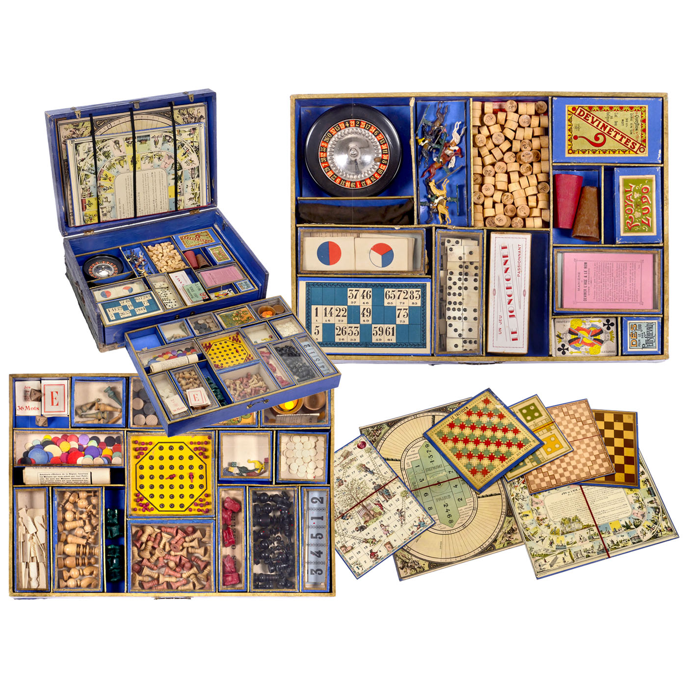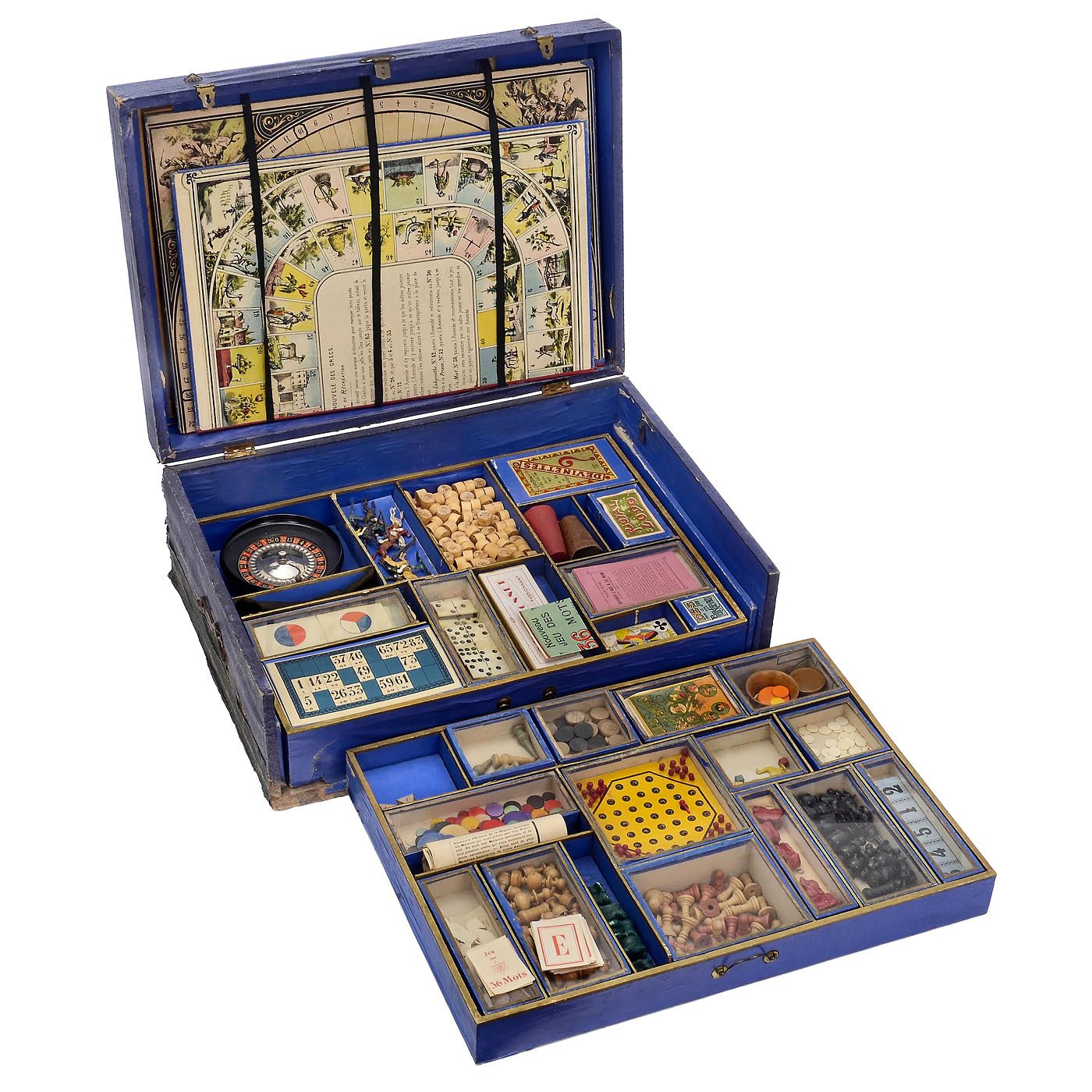 Large games box containing approx. 30 different games, including "Les Osselets" (knucklebones), "Jeu des sept Familles" (family quartet), "Devinettes" (question and answer game), "Royal Ludo" (Pachisi), "Le Jonchonnet" (Mikado), flea jumping, horse racing, roulette, board games and a very decorative war game presumably depicting