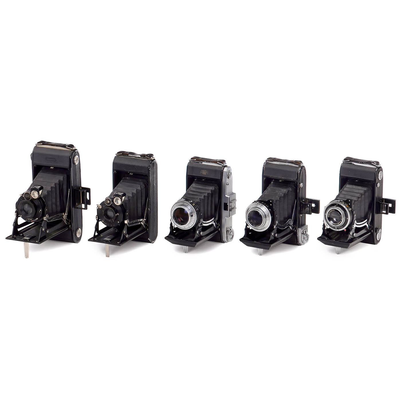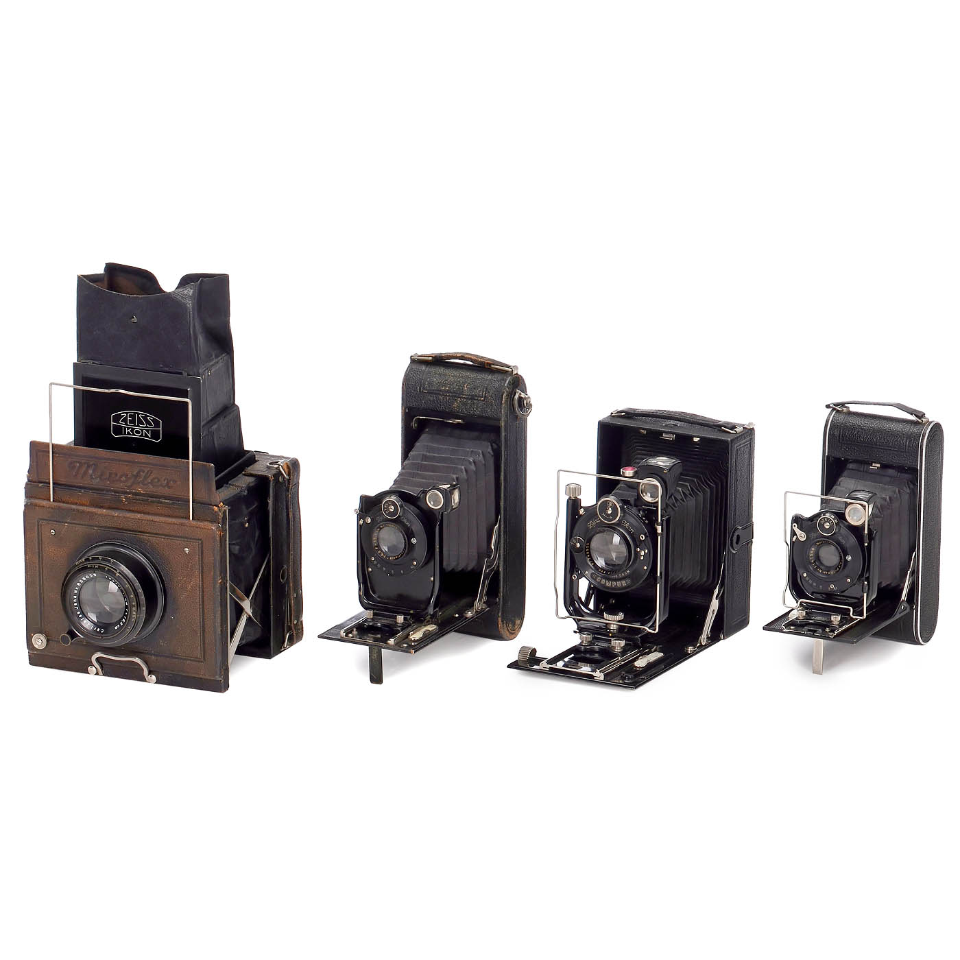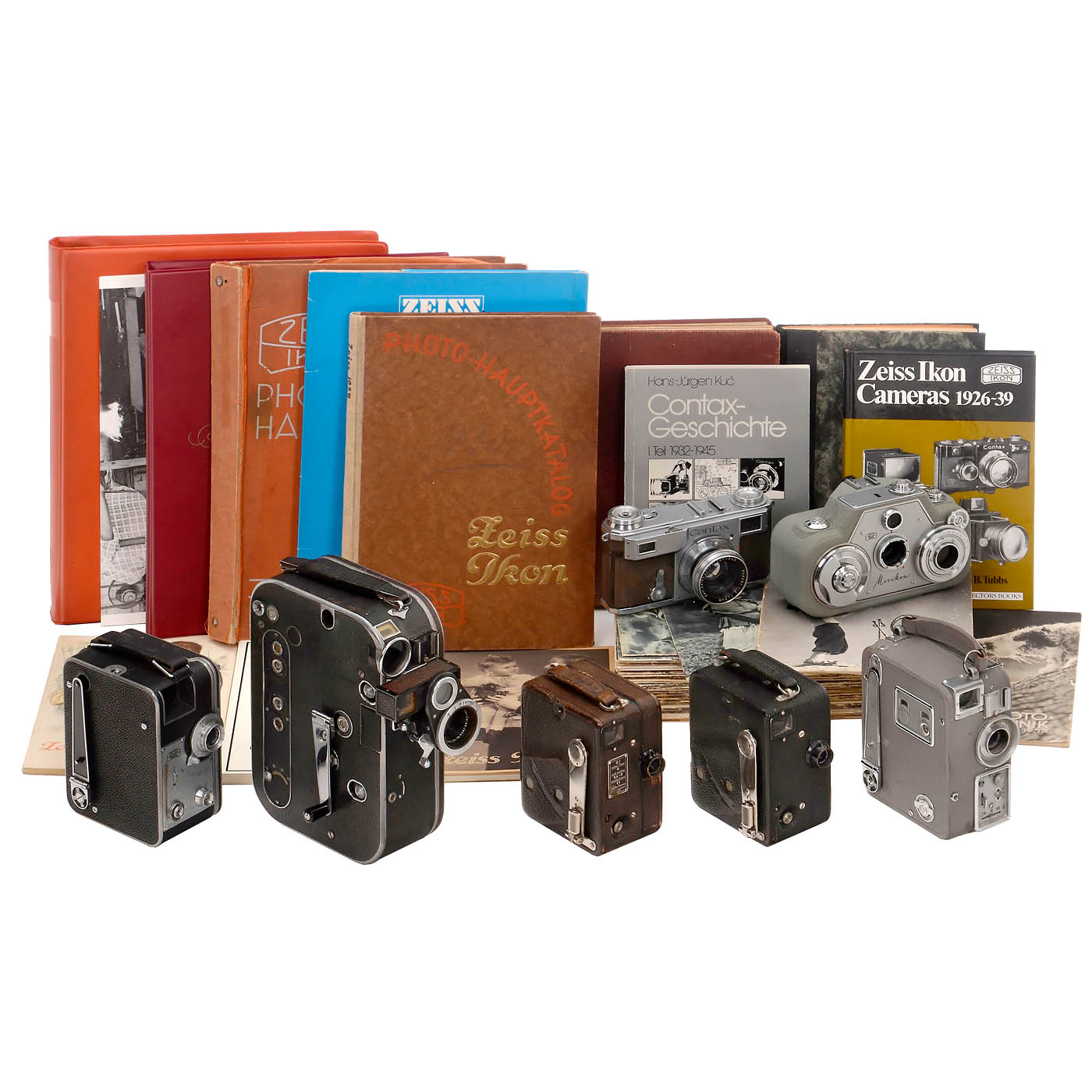 Zeiss Ikon, Dresden and Stuttgart. 1–6) 6 well-preserved movie cameras from the Movikon 16 onwards, all 6 motors running. – 7–21) 15 cameras. From the Atom, Cocarette, Contax II and III, Donata, Ercona, Ikonta, Miroflex, Nettar to the microscope camera; all in varying condition, some in mint condition. – And: 22–50) 3 main catalogs from 1927, 1929 and 1934, brochures, reference books, various Zeiss Ikon magazines "Phototechnik" 1927–1938, as well as Zeiss Oberkochen brochures.
