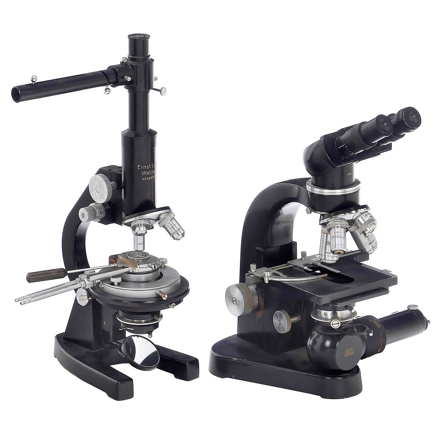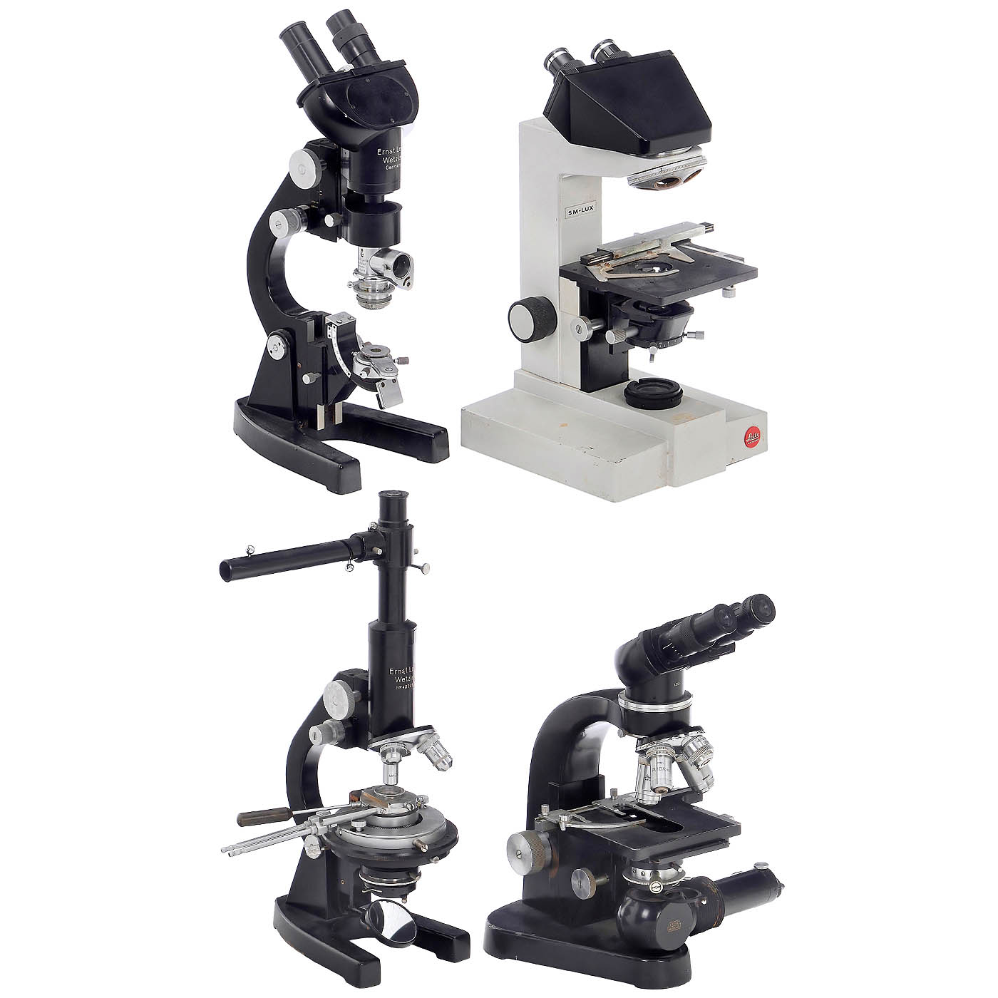 Wetzlar. 1) Laborlux SM, binocular microscope, no. 496227, 1956, electric illumination, condenser, rectangular stage, quadruple turret with objectives, binocular tube l.25x, height 36 cm. – 2) G-stand, c. 1960, no. 422219, triple turret, with heatable table, height 42 cm. – 3) SM-Lux, c. 1963, no. 635522, binocular tube, electric illumination, five-part turret, without objectives. – And: 4) Binocular re?ected-light microscope, c. 1957, no. 510972, without stage and illumination, height 45 cm.