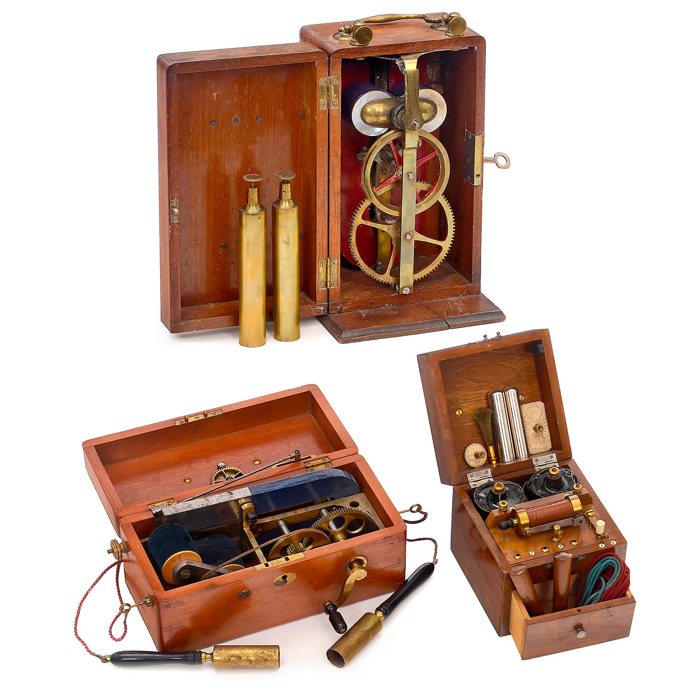 1) Electro-magneto machine, vertical mahogany case, with horseshoe magnet and two coils, hand-cranked, with two electrical connections and two handles. – 2) Electro-magneto machine, horizontal mahogany case, with horseshoe magnet and two coils, hand-cranked, with two electrical connections and two handles, improved magnetic indicator on the lid. – And: 3) Electro-therapy apparatus, small model, with dry battery units, drawer with accessories, size 5 x 5 x 5 in.