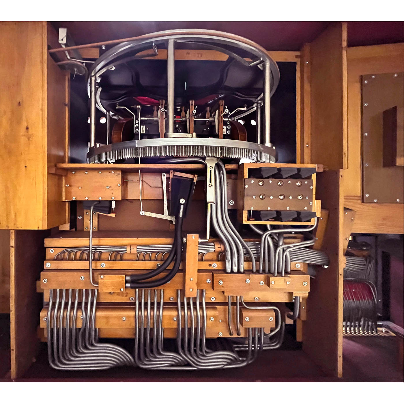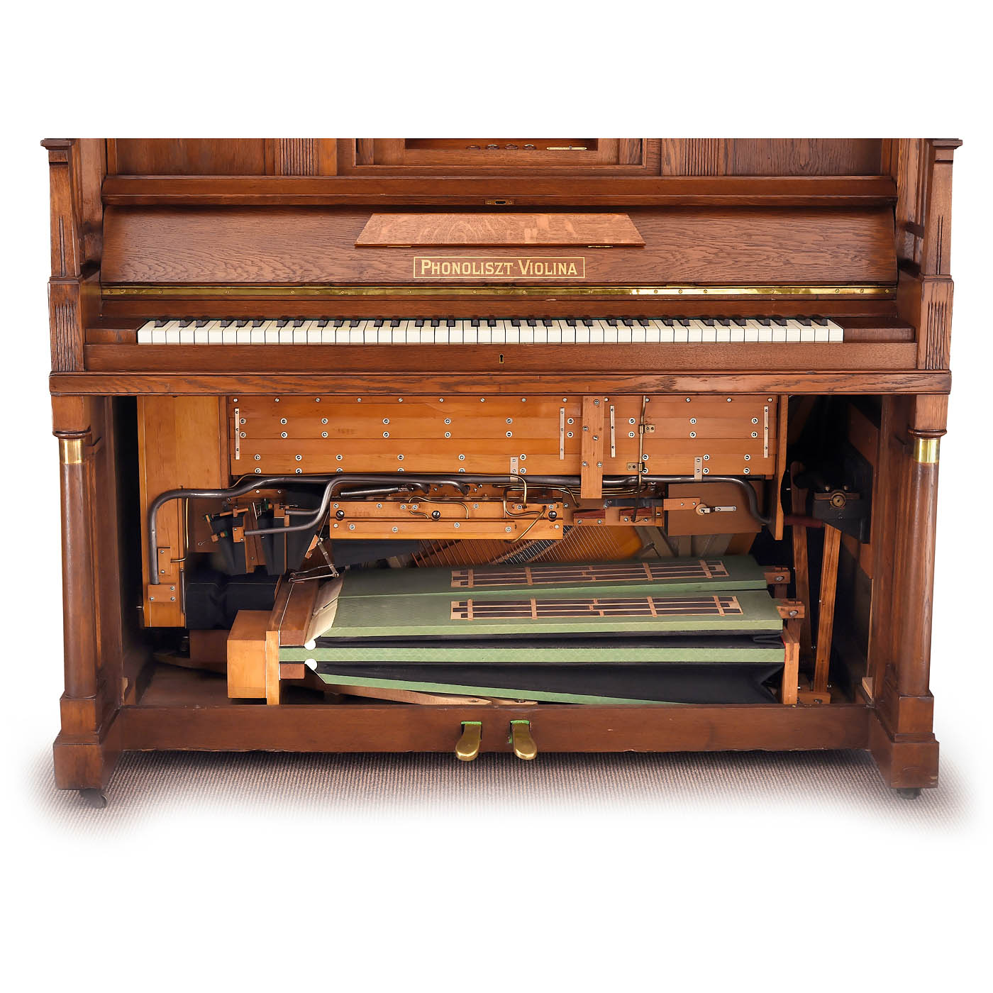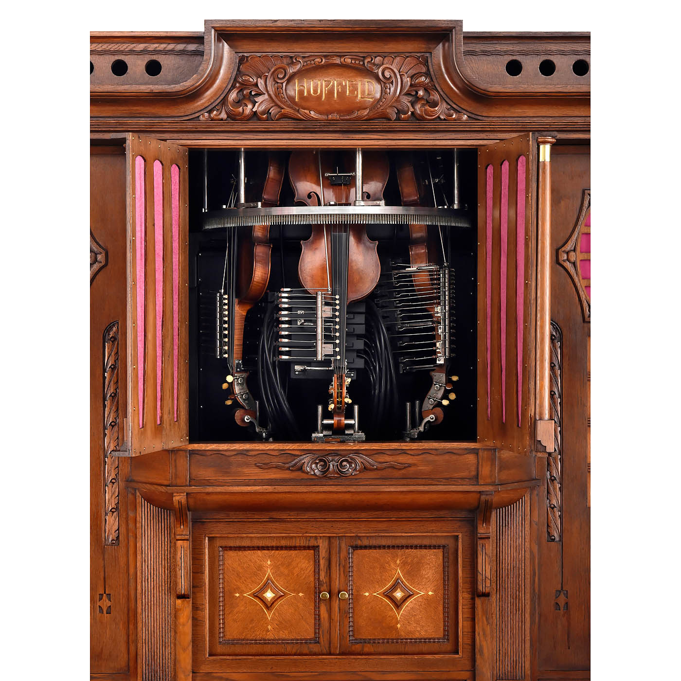 Ludwig Hupfeld A.G., Leipzig. Coin-activated pneumatic orchestrion with piano and three violins, driven by a 230-volt electric motor, in oak case with cloth-backed fretwork panels, rounded doors and carved integral pediment flanked by brass-capped columns, 166 x 119 x 225 cm, playing condition, the violins in need of tuning, more air pressure is requested, with 93 old and re-cut music rolls. – Note: A single string (D, A and E) is played on each of the violins, while the other strings resonate. The traditional violin bow is replaced by an octagonal wheel laced with horsehair. The sensitivity and finesse of the rendition are achieved by the speed of the bow, the pressure of the violins on the bow and the artificial fingers. Thus, a number of different types of stroke, including legato, staccato and vibrato, can be represented expressively in mechanical form. To accompany this, 44 piano notes are played with nuance.
