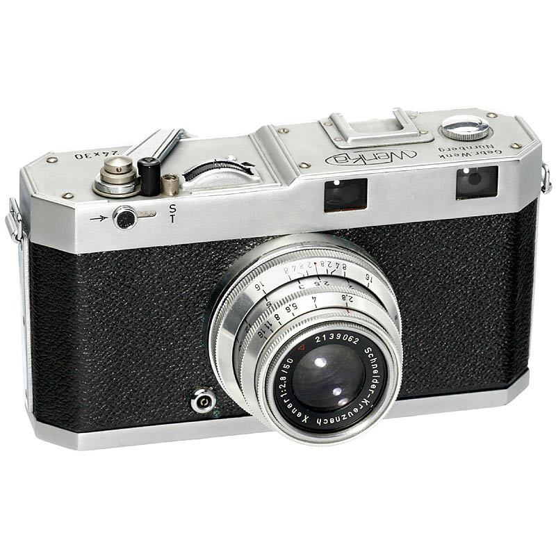 Gebr. Wenk, Nuremberg. 型号 "0a", 规格24 x 30 mm, 联动测距仪, 快速过片杆. 可换镜头Xenar 2,8/50 mm (M40), 金属卷帘式快门最快可达 1/800 sec. 正好位于镜头后(有点慢), 非常原始的罕见35mm相机.