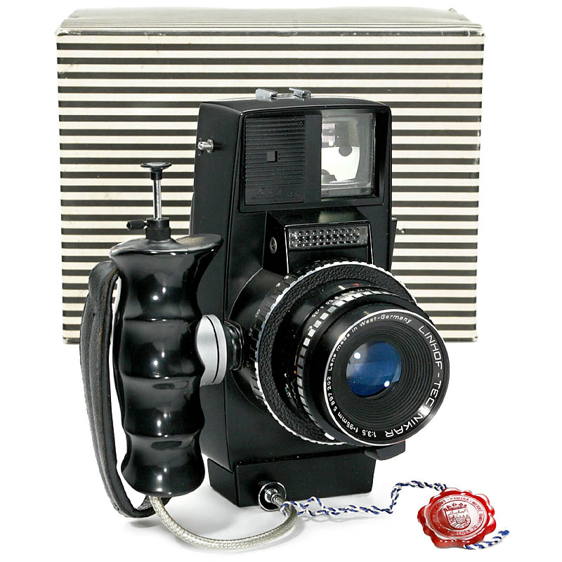 Linhof, 慕尼黑. 一边带手柄的56 x 72 mm 大幅皮腔相机, Technikar 3.5/95 mm 镜头, 同步康普快门, 测距仪, 测光表 (功能正常), 快门目前不能用. Linhof 系列罕见的一台速拍相机. 带原装盒.