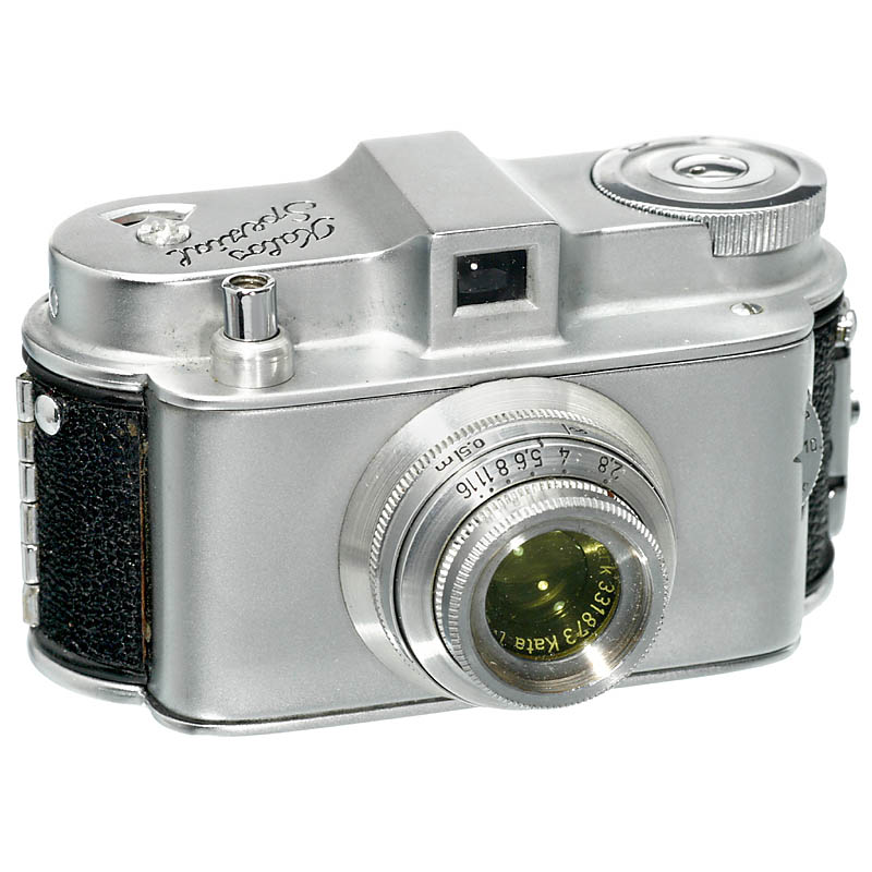 Kalos Camerabau, Karlsruhe. 尺寸9 x 12 mm ,16mm 胶卷, Staeble-Werk镜头 Kata 2,8/25 mm, 机身号1495, 快门 1/2–1/200 sec., 配有黄色滤镜和箱子. – "Kalos Spezial"比后来Kunik制造的 Petitux IV更加罕见 . –成色好!
