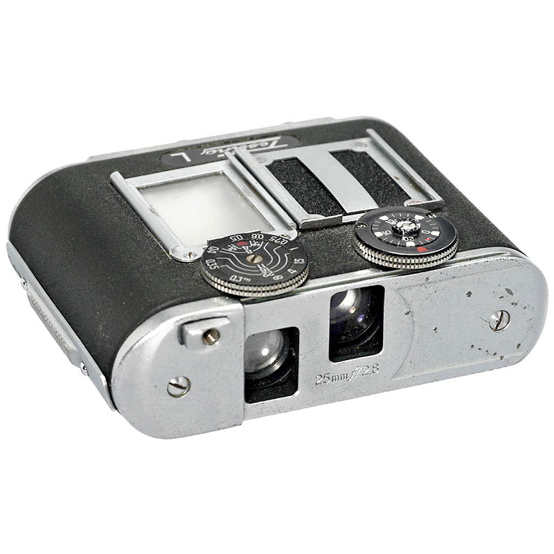 Concava, Lugano. 瑞士精密相机,适合14 x 21 mm微型图片 35mm胶卷, 黑色, Tessinon 2,8/25 mm镜头.罕见无声版本. 镜头盖缺失.