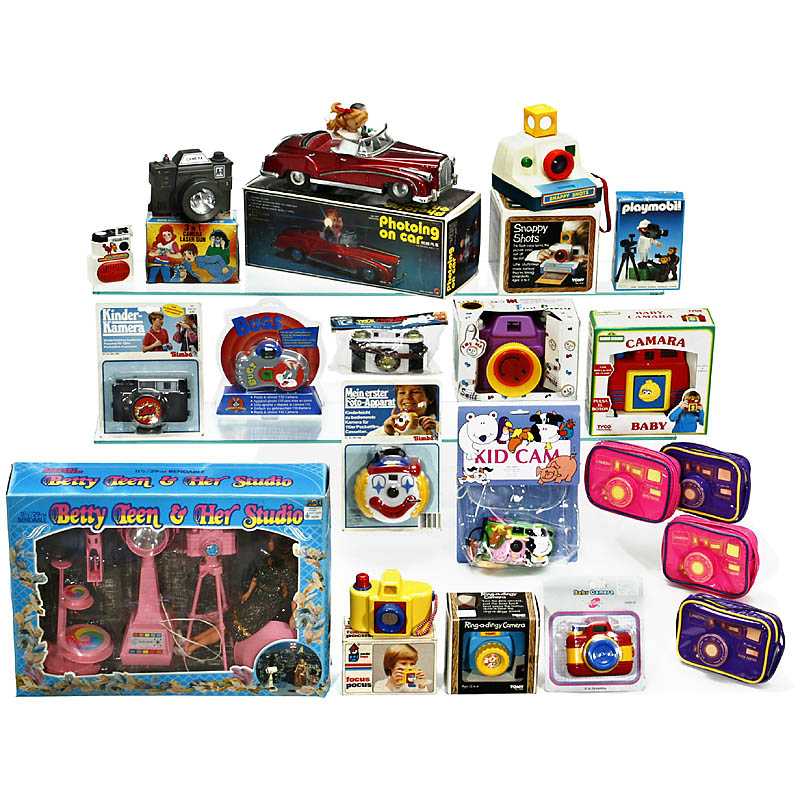20部风格各异的玩具相机,大部分是原包装."Photoing on car",附图.Snappy Shots "Tomy",Ring-a-dingy相机, Playmobil及更多.