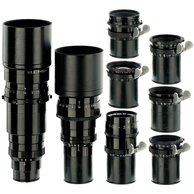 Kinoptik, 巴黎. 8支镜头: 1:1,8/18 mm, 1:2/25 mm,1:2/28 mm, 1:2/35 mm, 1:2/50 mm, 1:2/75 mm, 1:2/100mm, 1:2,5/150 mm. – 很少供应.全套法国顶级镜头,带Arriflex卡口.