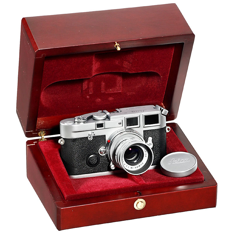 Leica, Solms. 纪念版“莱卡M 1954-1994 40周年”特殊号码 1977-17,新的适配 Elmar 2.5/80 mm, Leica M6 中也有些 Leica M3的特征,限量发行1640 台,皮革包,木质小盒,有说明书和外包装盒---是每一个Leica M 收藏者的梦想