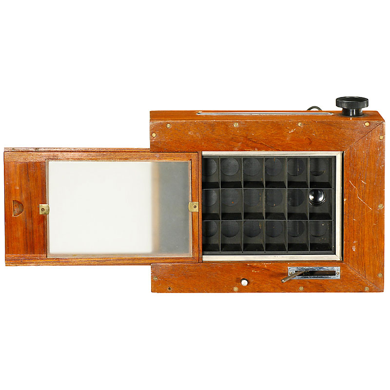 Foko, Stockholm. 用于18张照片拍摄(2.5x4 cm), 底板大小:12x16 cm, Trioplan 3.5/7.5 cm, 快门速度 1-1/150 秒,没有取景器. 对于当时的专业相机来说,这台相机成色极好,同时也保养的非常好. 十分罕见!参考文献:Cornwall, “Historische Kameras”,no.655.