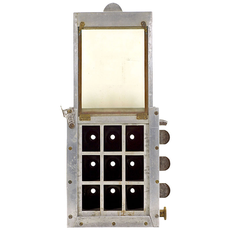 9个透镜头及6个快门阀,用于每三张相同的水平或垂直的照片, 底板 9x12 cm.---未标记!没有其他出名的版本. 未在文献中被提及,可能是一台样机.---十分引人注意!