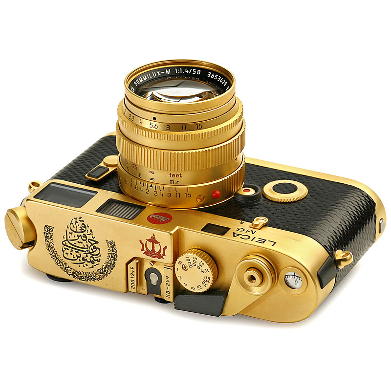 Leica, Solms. Serial no. 2001249, number of the limited edition HB-249, one of the golden M6 cameras from the reserved serial number range 2001000–2001353. This reserved serial number range 2001000–2001353. This is not the better known "Leica M6 Platinum, Sultan of Brunei" from 1995 (see McKeown, p. 607), it is the 24 ct gold edition from 1994, manufactured belatedly on the occasion of the silver jubilee of the Sultan, and given to dignitaries in Brunei. The top plate of this M6 shows two engravings in red and black of royal emblems. The fitting lens Summilux-M 1:1,4/50, no. 3653628, has the additional engraving "Sambutan Jubli Perak, 5. Oct. 92". Never used, with solid wooden box with inserted engraved panel, instructions, warranty card and special box. This limited edition was never distributed commercially