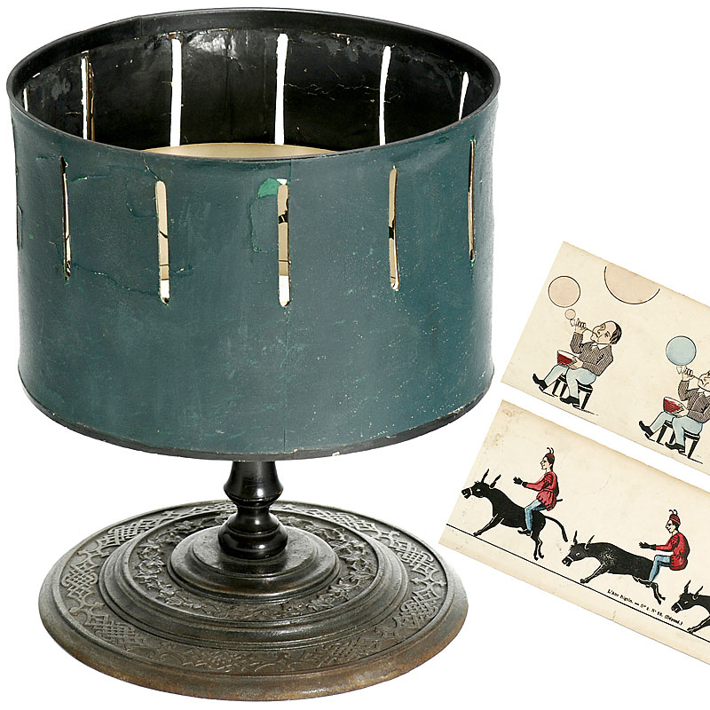 "May Brevete S.G.D.C. F. Delacour & Bakes, Paris". 早期的法国西洋镜, 金属支座, 转筒直径: 11 3/4 in., 带一个双面狭长纸条. – 极其美观, 罕见!