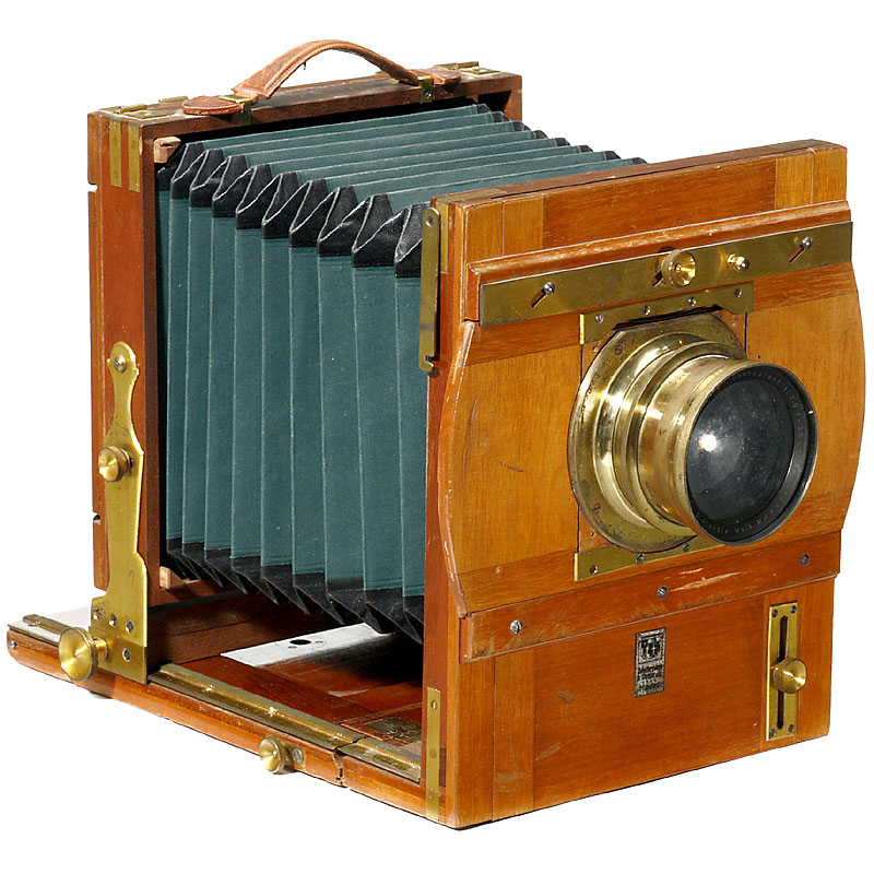 Optisches Werk Dr. Staeble & Co., 慕尼黑. 出自 Dr. Rudolf Loher 的收藏, 底板尺寸: 13 x 18 in. 贵木质机身带黄铜配件, 带稳定板加固, 方形绿色皮腔带黑色的角, Staeble Doppel-Anastigmat Choroplast 3.9/25 cm, no. 16054. 引人注意!