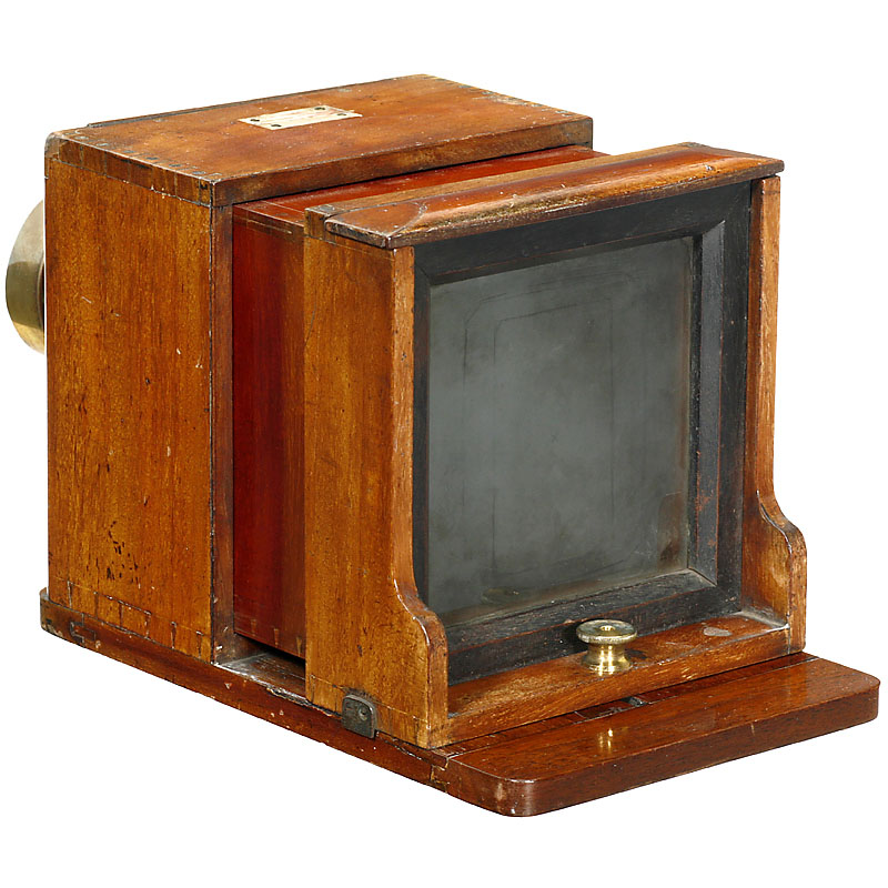 方形构造, 毛玻璃大小: 12 x 12 cm, 箱型相机大小: 18 x 19 cm, 底座板长27 cm, 热带木质机身带毛玻璃后背, 黄铜镜头“Dallmeyer, Lundon, No. 5306 ”, 驱动调节, 插入式光圈. -- 原始成色很好, 顶级博物馆收藏级别!