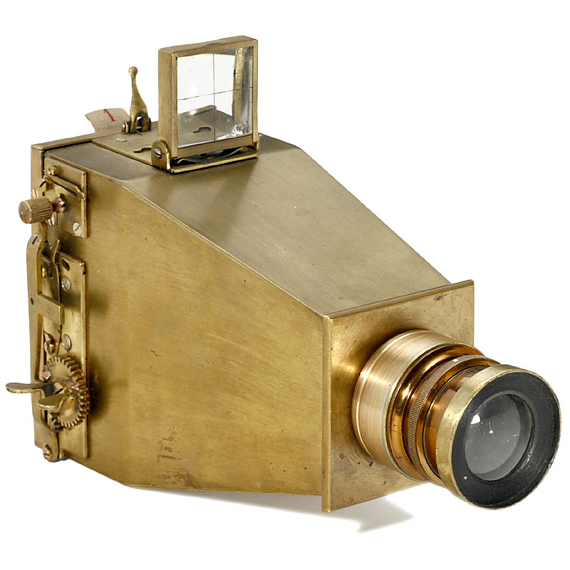 近代制作纯金属相机, 仿照/依据“Photo-Ticket”, 出自 Louis Terillon, 巴黎. Dalot 的继承者. 黄铜机身带帘幕式快门, 用于地板4.5 x 6 cm, 原装黄铜镜头“Plana-Symetrique F 1: 8”, 可变光圈. -- 参考文献: Micheal Auer,“Kameras gestern und heute”p. 140