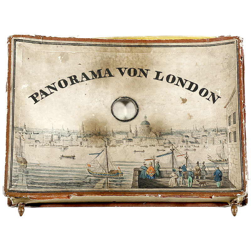 带活动背景, 2个后景, 手工着色的铜版画, 原装盒子, 26 x 20 cm. -- 十分罕见和早期的收藏!