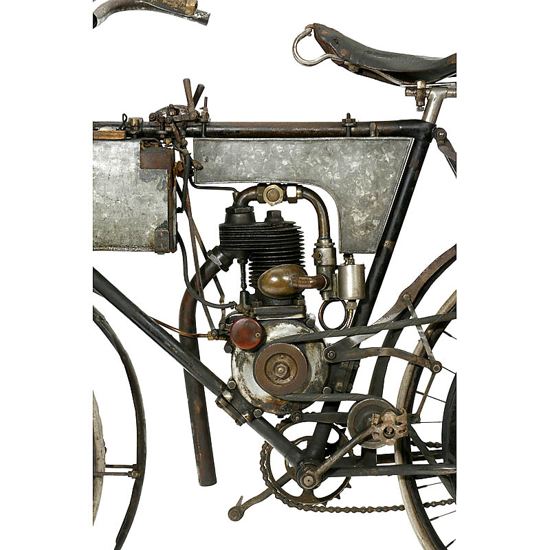 Unmarked, probably manufactured by "Minerva, Anvers", single-cylinder motor, drive with pulleys and belt, also with paddles and chain, carbide lamp. Engine turns freely! Barn find in unrestored original condition!