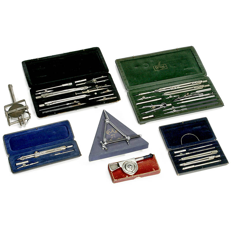 5 compass cases, 2 devices for the calculation of surfaces, mostly Swedish manufacturers.