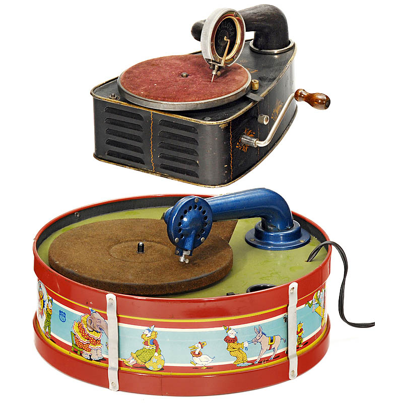 2) "Portofonic", c. 1955, J. Chein & Co, USA, lithographed circus motifs, 110 V, runs slowly.