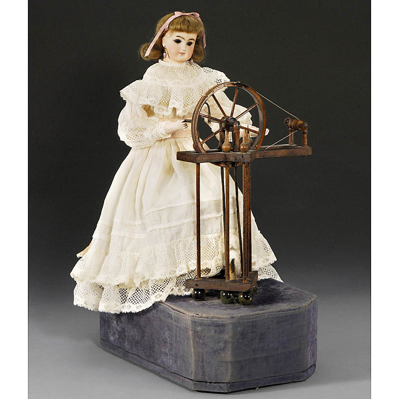 With French three-cam going-barrel motor driving figure's left arm, head and spinning wheel, German bisque belton-type head with closed mouth, pierced ears, fixed brown glass eyes and brown hair wig, later body in white lawn dress, seated at carved wood spinning wheel, on velvet-covered base inscribed "Works Repaired by Bob Gould, January 1954", height 17 ¾ in. (45 cm), 20th century manufacture with some earlier parts. In working order.